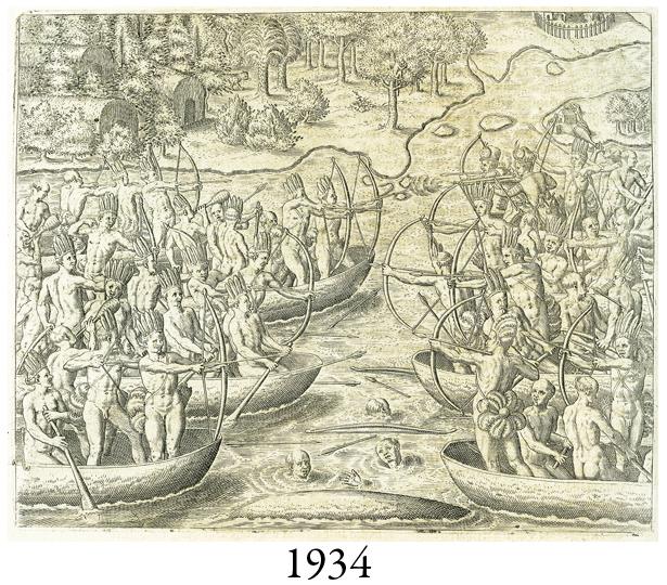 1591 Theodore deBry engraving of warring native Americans in canoes from a German book. 9-1/2" x 13-1/2". The upper half of this page from a German book of the period shows two teams of natives in canoes fighting a battle with bows and arrows, some of the unfortunates struggling in the water, their settlements and trees in the background, no color, perfect condition, the title of the book or chapter at the top of the page "Erfindung und Schiffarten", probably the impressions from the voyages of the English pirate Thomas Cavendish in 1587 and 1591.