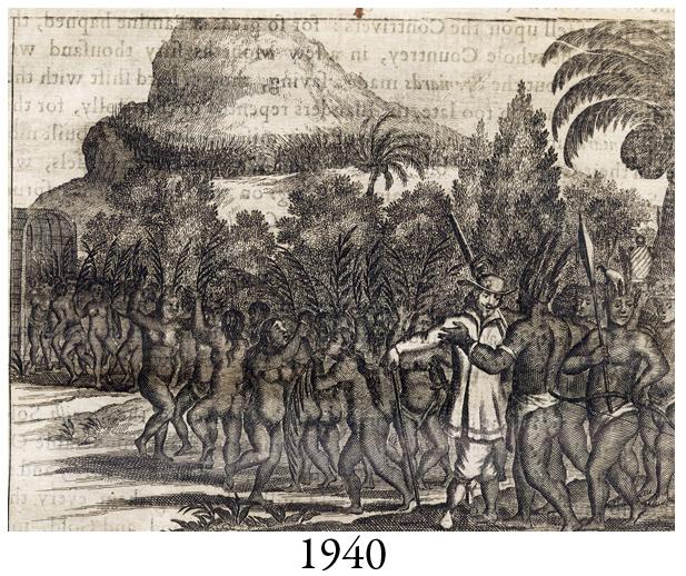 1671 Ogilby engraving of a single European among naked native Americans. 9-3/4" x 15-5/8". This is a page from a 1671 book by John Ogilby entitled America that was a translation of Arnold Montanus' book Die nieuwe en onbekende Weereld (Amsterdam, 1671), and this page shows a multitude of natives (mostly women) dancing around a European in a very aristocratic pose, excellent condition with fully readable text.