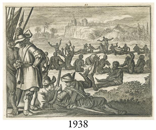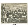 1671 Ogilby engraving of native Americans and Europeans. 9-1/2" x 15-1/2". This is a page from a 1671 book by John Ogilby entitled America that was a translation of Arnold Montanus' book Die nieuwe en onbekende Weereld (Amsterdam, 1671), and this page shows seated and gesticulating natives in a circle in front of 3 Europeans with guns and swords with European fortification in the background, excellent condition with fully readable text.