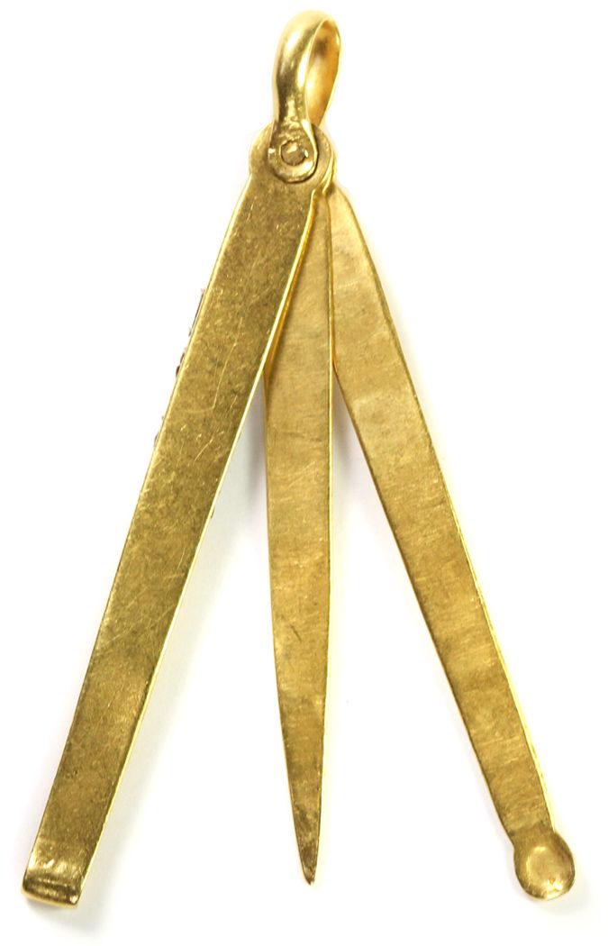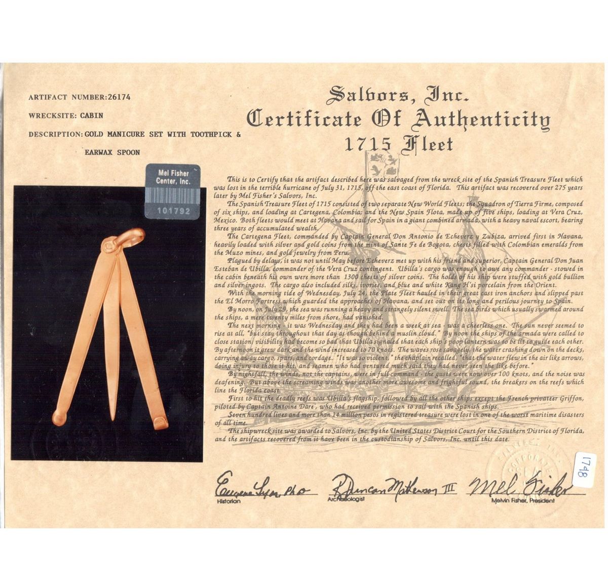Gold manicure set with toothpick and ear-spoon, found by Bob Weller in 1993 among the famous "Queen's Jewels." 7.1 grams, 2-1/2" long. Three plain, flat ribbons of gold, one terminating in a tiny spoon for ear-wax, one with a point for picking teeth and the third just an outer cover with tip folded over for holding the other two, with pinned oval ring at top for wearing on a chain, clearly high-karat gold and nicely intact, with extensive modern pedigree including it in a set of gold jewelry and other items that were documented as being on their way to Spain for the coronation of the new queen (see previous lot). From the "Cabin wreck" site (1993), with Fisher photo-certificate #26174 and shown in photos in Bob Weller's books Shipwrecks Near Wabasso Beach (with Ernie Richards, 1996, pp. 55 and 59) and Galleon Alley (2001, p. 160), and on the cover of the Treasure Quest magazine issue of September-October, 1997 (Vol. VIII-3), and in the Plus Ultra newsletter issue of 4th quarter of 1993 (Vol. 11, No. 4, p. 6). Recovered from: Spanish 1715 Fleet, east coast of Florida
