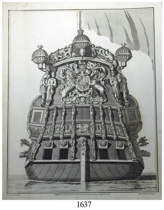 1800 London engraving of the stern view of a British Naval vessel. 9" x 11½". A detailed, closeup view of the back of a British ship of unspecified vintage, drawn by Vandevelde, engraved by Charles Tomkins and printed by G.J. and G Robinson, good condition.