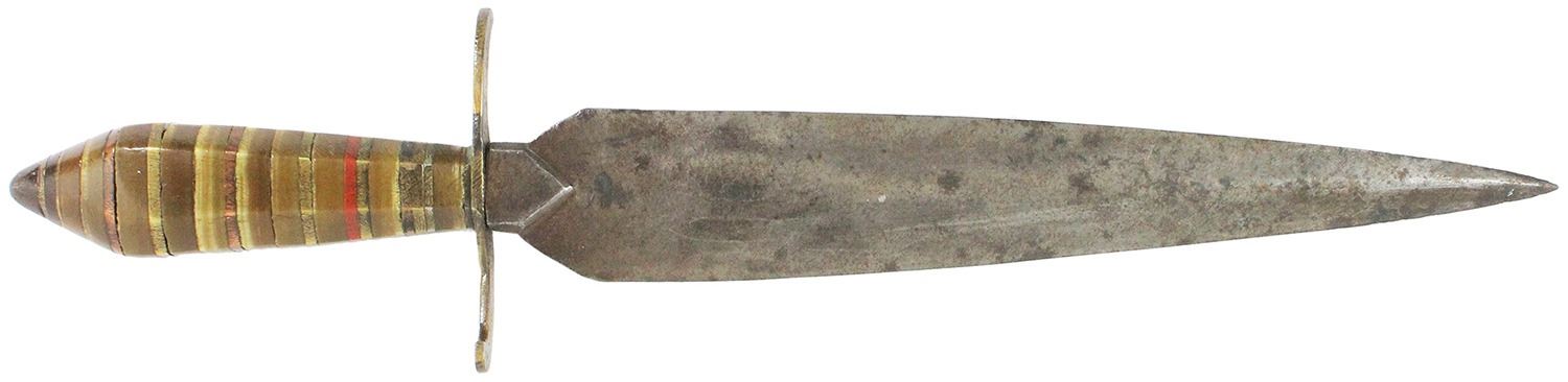1800s Spanish colonial sailor's dirk. 329 grams, 13-1/2" long, 9-1/4" blade. Decorative, well-made double-edged knife with spear-point blade, cut out S-shape brass guard and handle made of layers of multi-colored horn, brass and copper, from a Florida collection and originally from South America, overall very good condition with age-toned steel, hilt lightly polished. With photo-certificate.