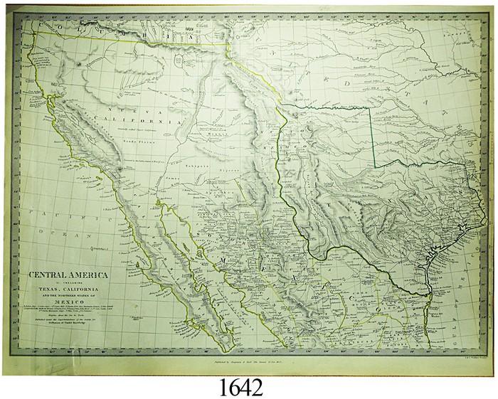 1842 British map (S.D.U.K.) of Texas, California and northern Mexico with hand-colored borders. 15½" x 13". A well-detailed and hand-colored, steel-engraved map of what is now the western U.S. but at the time was just Texas (a separate Republic), California (under Mexican administration) and northern Mexico, entitled "Central America including Texas, California and the northern states of Mexico," printed in London for the Atlas of Atlases by the Society for Diffusion of Useful Knowledge (in operation from 1826 to 1846 "to provide improving information at affordable prices for people who would otherwise have been deprived of education"), excellent condition.