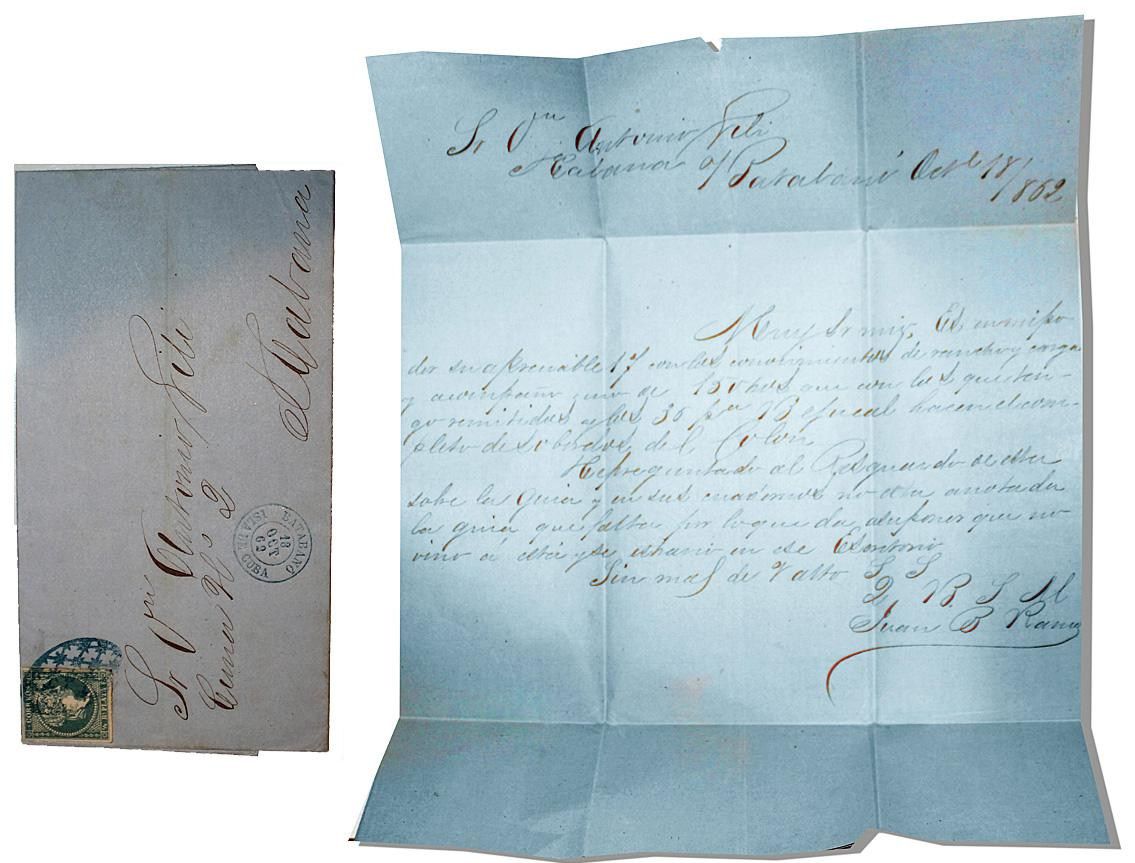 1862 Cuban letter and envelope with stamp. 8-1/2" x 10-1/2" (fully opened). Hand-written in neat script on blue paper (folded), with seal, postage stamp and two postmarks, topic unknown.