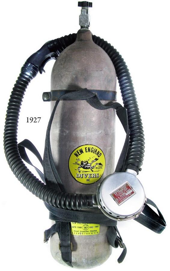 1956 "Rene" dive tank with original harness and New England Divers decal and inspection sticker plus ca.-1957 U.S. Divers Corp. "Stream Air" Aqualung double-hose regulator. 36 lb, 28" tall. Display combination of 1950s-era tank (with valve) and regulator, both in used condition (some corrosion on the back of the regulator) but fully intact, last inspected in 1979 (sticker on tank), probably not usable today but with obvious antique and demonstrative value.