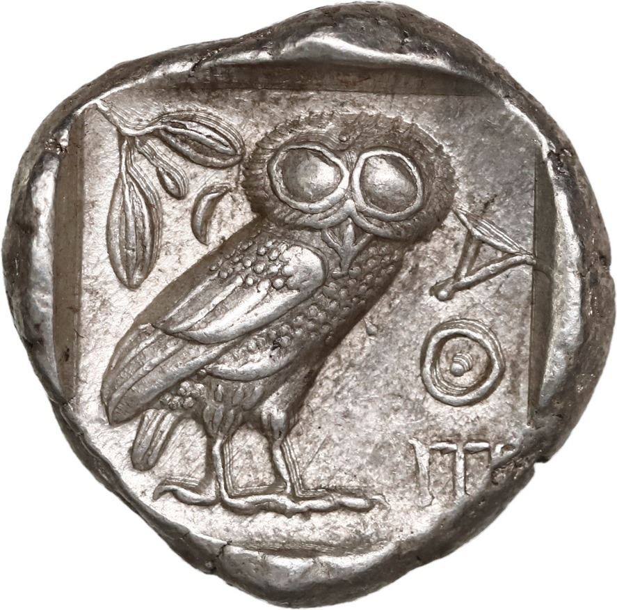 ANCIENT GREEK, Athens, Attica, AR tetradrachm, 454-404 BC, "owl." Copenhagen 31-40; Kroll 8. 17.22 grams. Helmeted head of Athena right, with frontal eye / Owl standing right, head facing; olive sprig and crescent to left, all within incuse square. XF typical high-relief coin, well centered, especially the well-detailed owl, a small nick on Athena's chin, among the most widely recognized ancient coins.