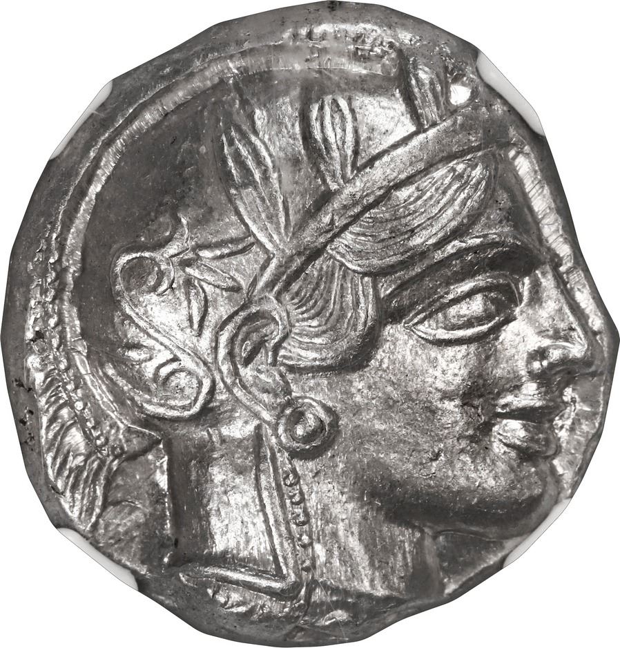 ANCIENT GREEK, Athens, Attica, AR tetradrachm "owl," 440-404 BC, NGC Ch AU (strike 5/5, surface 4/5). Copenhagen 31-40; Kroll 8. 17.20 grams. Helmeted head of Athena right, with frontal eye / Owl standing right, head facing; olive sprig and crescent to left, all within incuse square. Silverish toning with complete, well-centered design on both sides (especially the owl), among the most widely recognized ancient coins.