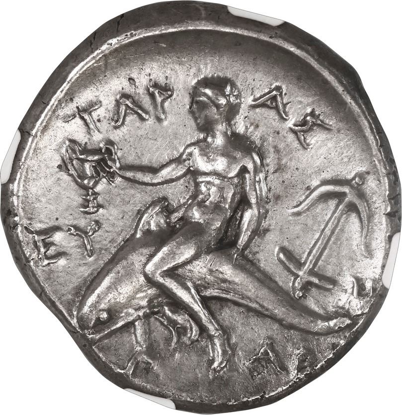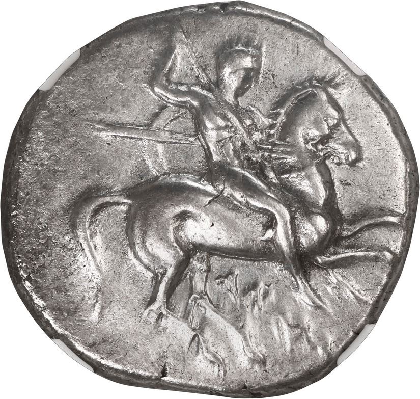ANCIENT GREEK, Calabria, Taras, AR didrachm, 302-280 BC, NGC XF. Vlasto 691; SNG ANS 1065; HN Italy 966. Nude, helmeted warrior on horseback right, holding spear in right hand and shield in left hand / Taras astride dolphin left, holding kantharos; EY in left field, AP below, anchor in right field. Well centered with exceptional strike on reverse.