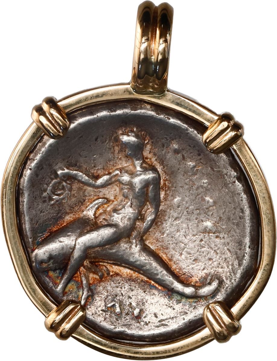 ANCIENT GREEK, Calabria, Taras, AR nomos (didrachm), circa 291 BC, "boy on dolphin," mounted dolphin-side out in 14K gold pendant with fixed bail. Vlasto 689; HN Italy 965. 11.84 grams total. Nude youth on horse galloping left, shield in left hand; ?I to right / Taras astride dolphin left, holding wreath in his outstretched right hand; ????? behind, ?? below. XF coin with soft details, reddish toning in crevices, mounted in a custom, flat-sided bezel with four prongs.