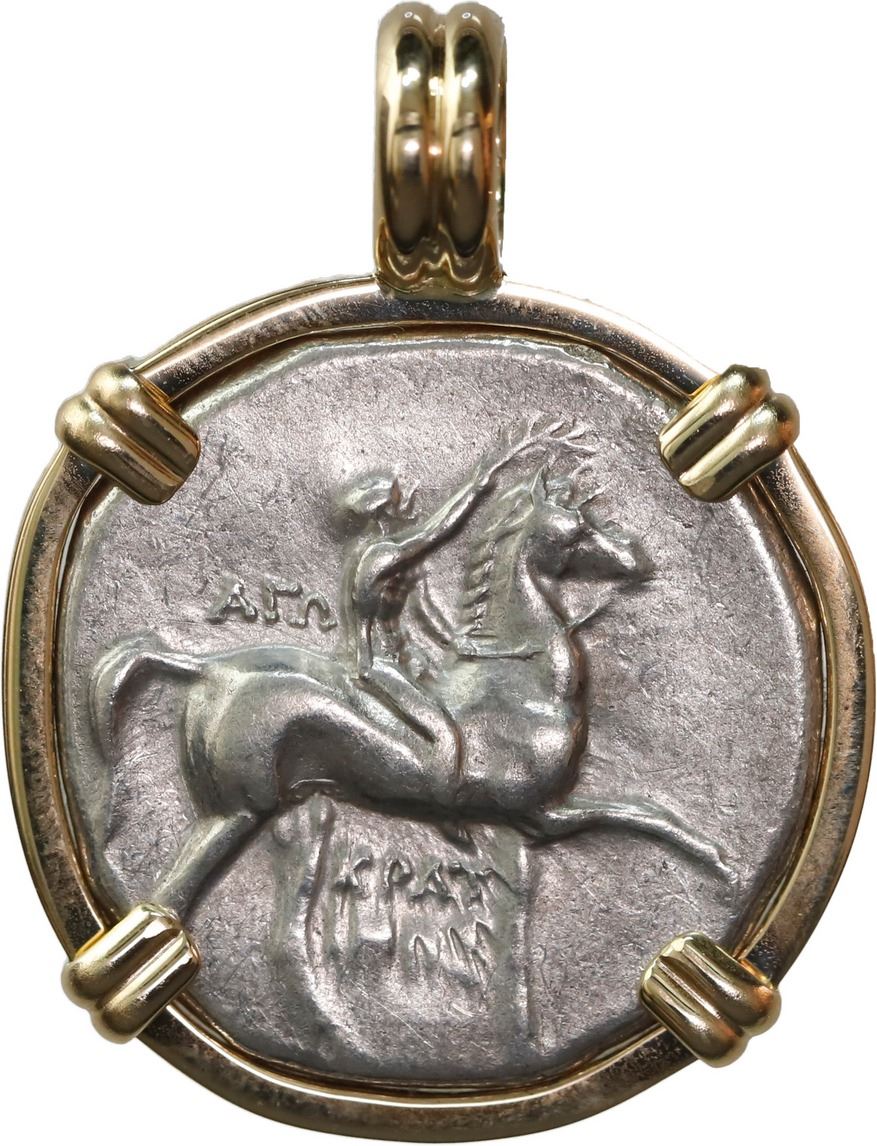 ANCIENT GREEK, Calabria, Tarentum, AR didrachm, 302-281 BC, "boy on dolphin," mounted in 14K gold pendant with fixed bail. 11.23 grams total. Helmeted nude warrior on horse prancing right / Taras astride dolphin left. Struck in medallic alignment so pendant can be worn either side out (desirable thus). Bright silver XF coin, well centered in a four-pronged custom setting with a flat-sided bezel.