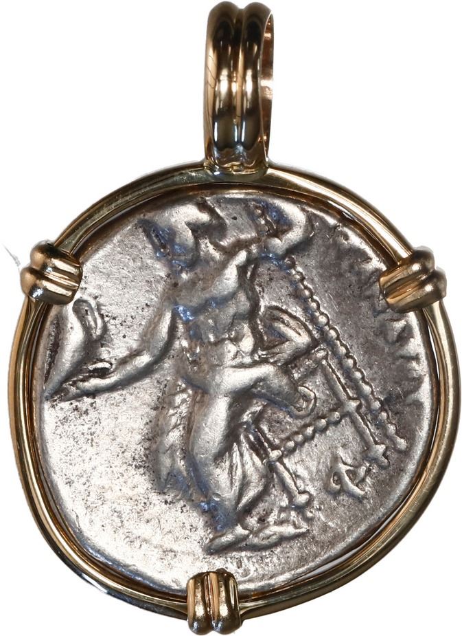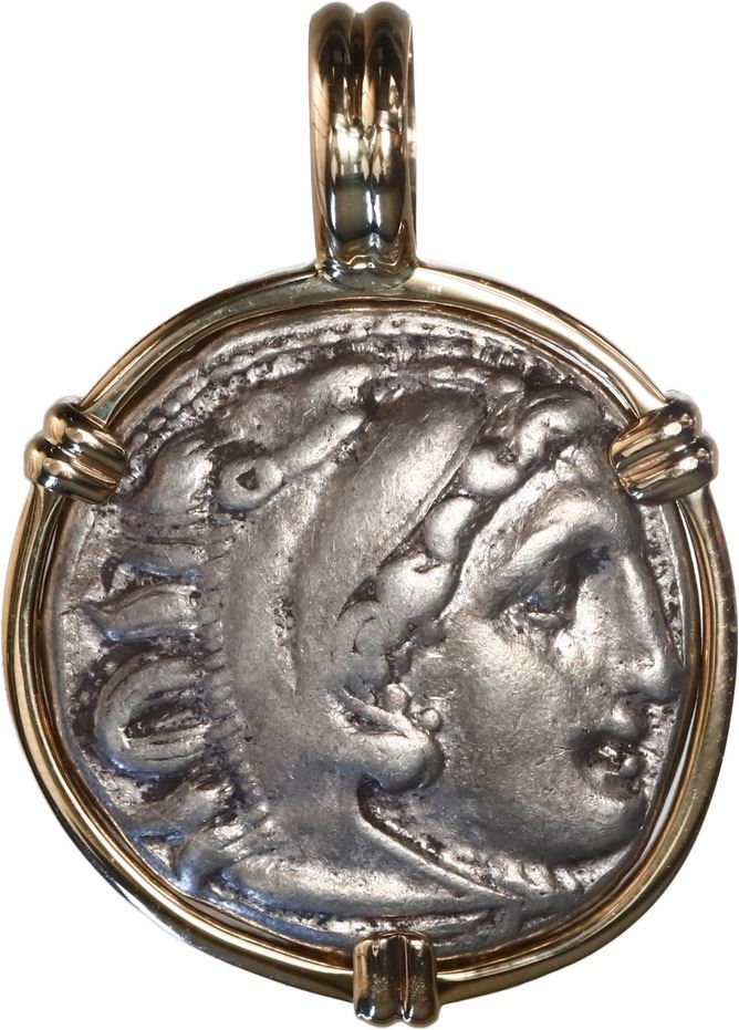 ANCIENT GREEK, Kings of Macedon, AR drachm, Alexander III ("the Great"), 336-323 BC, mounted bust-side out in 14K gold pendant with fixed bail. 5.53 grams total. Head of Herakles right, wearing lion's skin headdress / Zeus seated left, holding eagle in right hand, scepter in left. XF coin with good details and lightly toned, mounted in a dainty, custom, flat-sided bezel with three prongs.