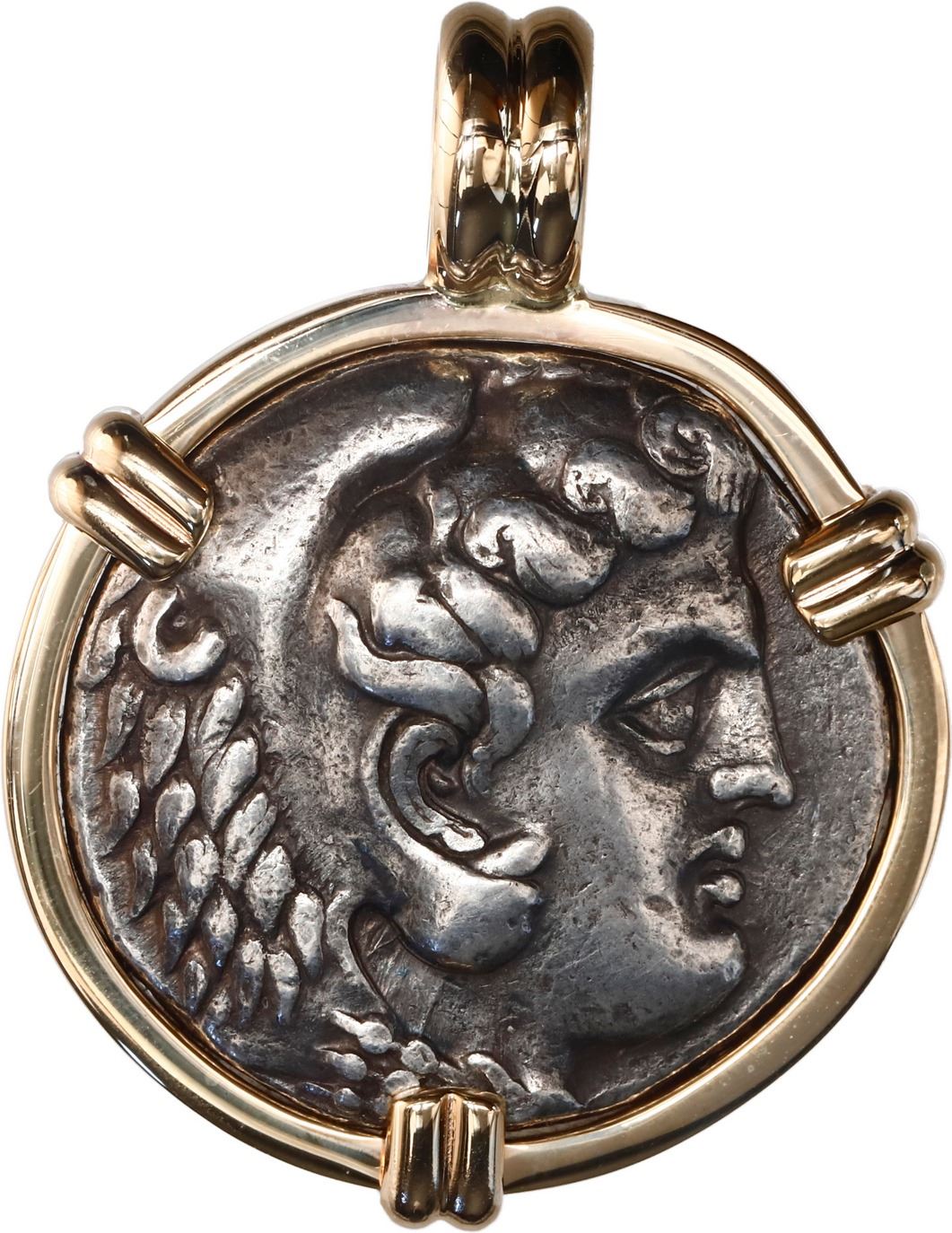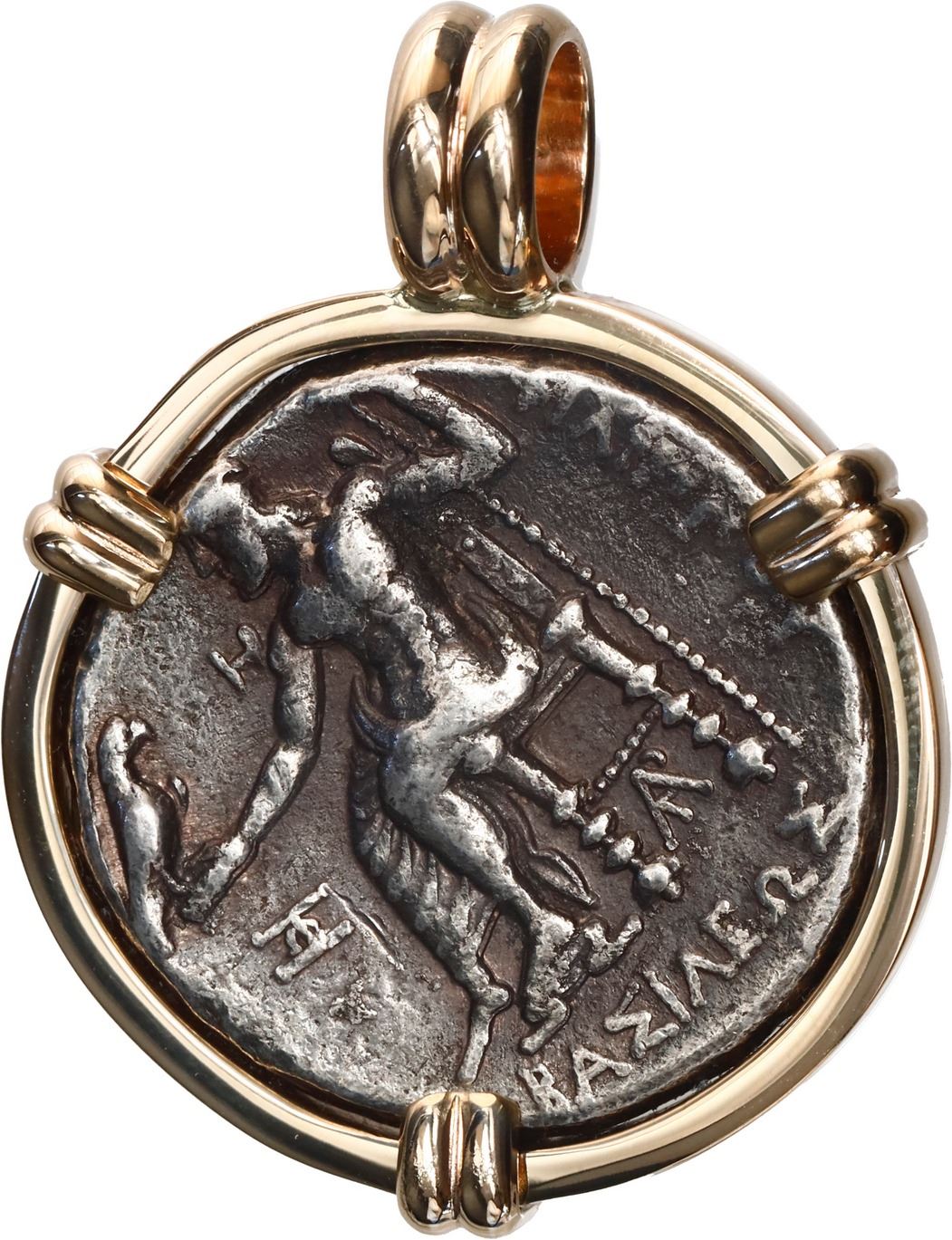 ANCIENT GREEK, Kings of Macedon, AR tetradrachm, Philip III Arrhidaios (323-317 BC), 323-300 BC, mounted bust-side out in 14K gold pendant with fixed bail. Price P162. 24.27 grams total. Head of Herakles right, wearing lion's skin headdress / BA?I?E?? - ???????? Zeus seated left, holding eagle in right hand, scepter in left. Deeply struck XF coin, well centered and chunky, richly toned all over and mounted in a custom, flat-sided bezel with three prongs.