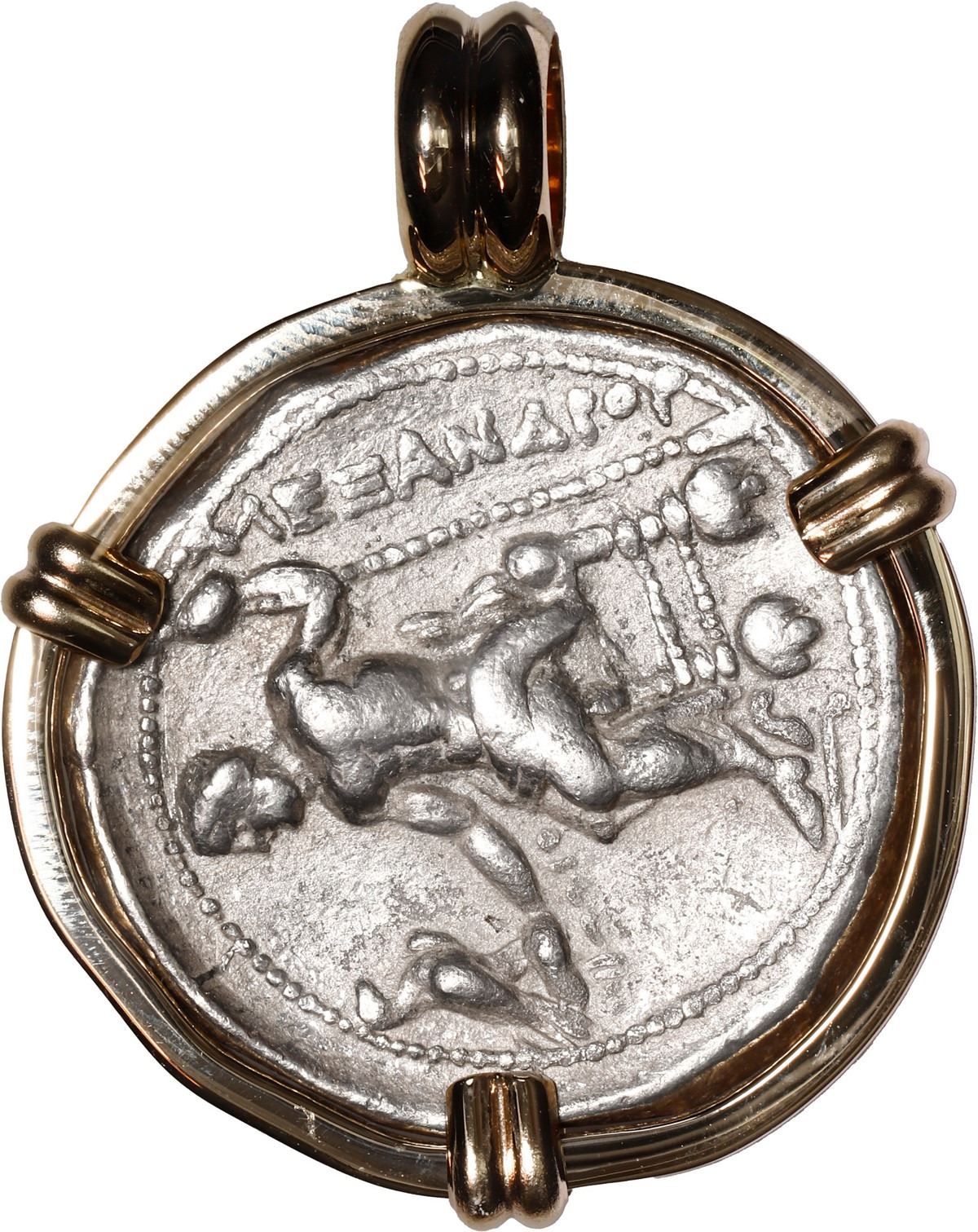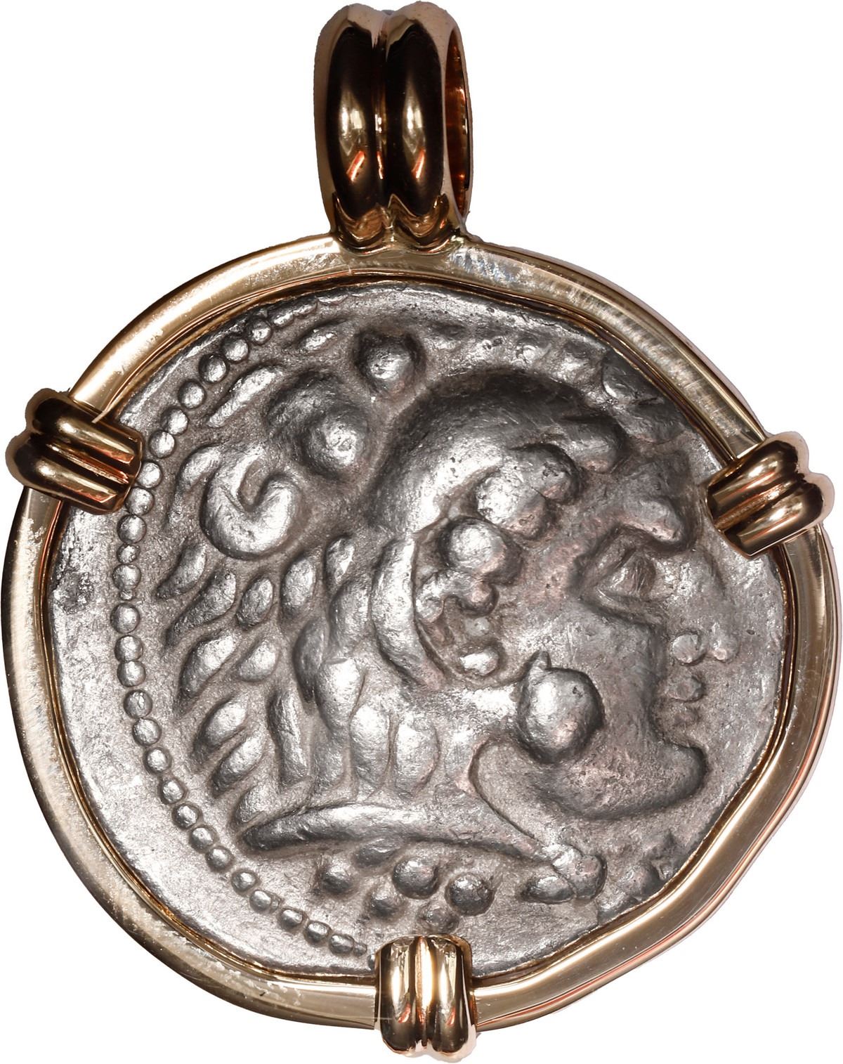 ANCIENT GREEK, Kings of Macedon, Ake-Ptolemais mint, AR tetradrachm, Alexander III ("the Great"), posthumous issue, 316-315 BC, mounted head-side out in 14K gold pendant with fixed bail and three prongs. 24.49 grams total. Head of Herakles right, wearing lion's skin headdress / Zeus seated left, holding eagle in right hand, sceptre in left. Hefty piece (typical of the denomination) in a sturdy, custom, flat-sided bezel, rich in detail but slightly off center.