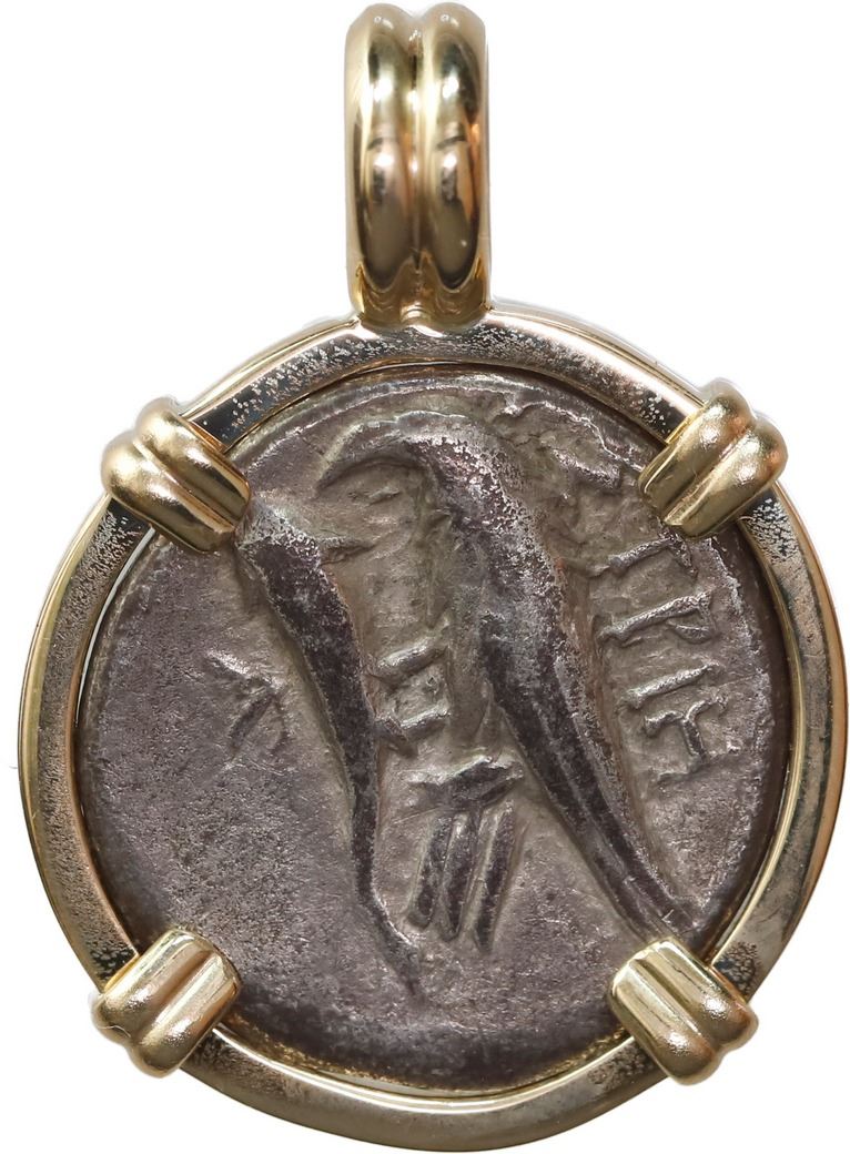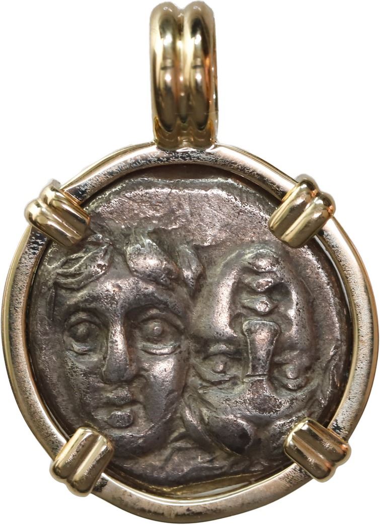 ANCIENT GREEK, Moesia, Istros, AR drachm, 313-280 BC, mounted heads-side out in 14K gold pendant with fixed bail. 8.37 grams total. Facing male heads, the right inverted / Sea-eagle left, grasping dolphin with talons. Dainty flat-toned XF piece, well centered, and mounted in a four-prong setting with flat-sided bezel.