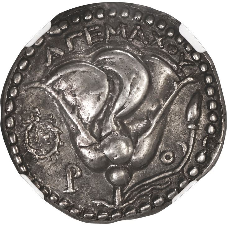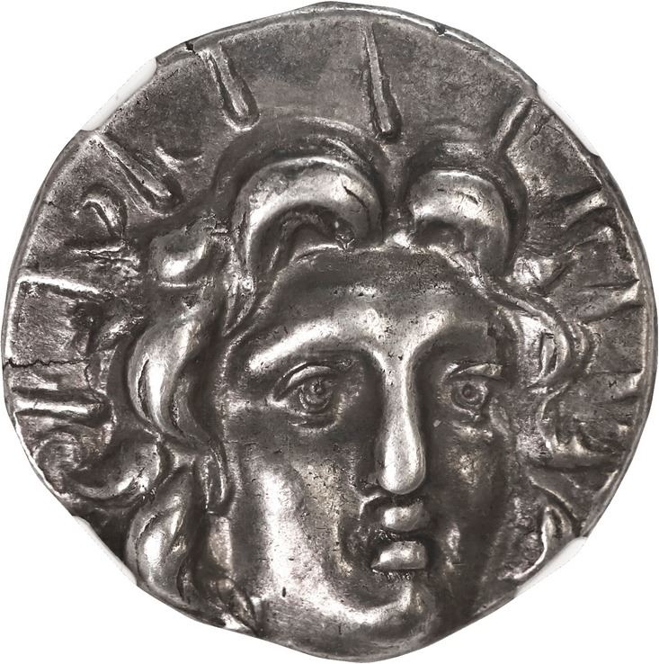 ANCIENT GREEK, Rhodes, Caria, AR didrachm, Agemaxou magistrate, ca. 205-190 BC, NGC XF (strike 4/5, surface 4/5). Ashton 277. 6.61 grams. Radiate head of Helios facing slightly right / Rose with bud to right, wreath and P left, magistrate's name above. Deeply struck with exceptional details, especially on reverse, a lovely example of a popular coin.