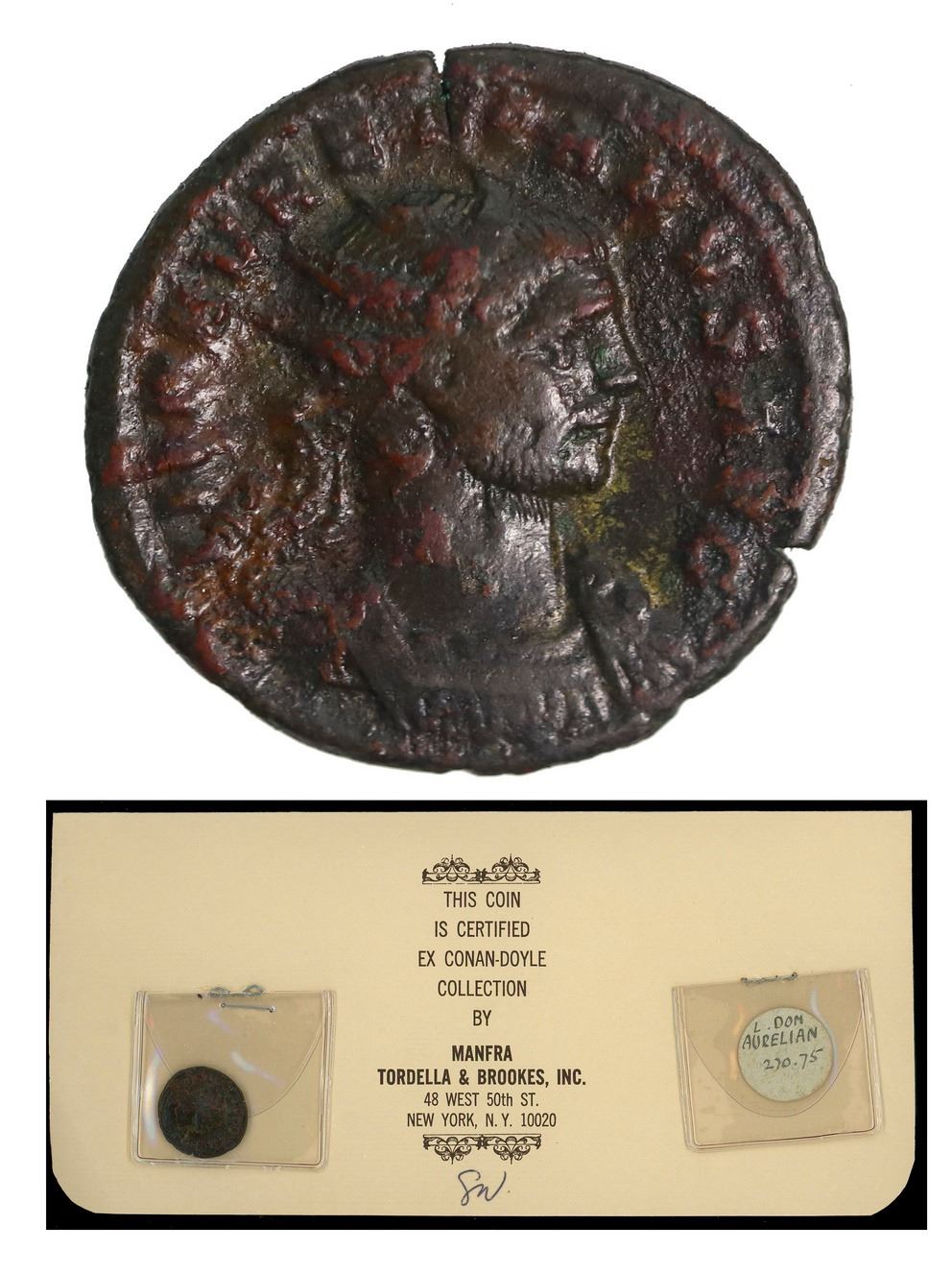 ANCIENT ROMAN, Roman Empire, AE antoninianus, Aurelian (270-275 AD), ex-Sir Arthur Conan-Doyle. RIC 61. From a collection of about 500 ancient coins owned by Sir Arthur Conan-Doyle acquired by the New York numismatic firm MTB and offered for sale in 1968. The coin offered here has a lacquered appearance, VF with chocolate brown coloring, and shows a radiate cuirassed bust facing right / Sol standing left, holding globe and raising right arm, a captive seated at his feet on either side. Conan-Doyle's neatly handwritten notation of "L. Dom Aurelian 270.75" is on a separate paper disc. While the coin may be incidental, the rest is a fascinating bit of history. Attached to a paper certificate from Manfra Tordella & Brookes titled FROM THE COLLECTION OF Sir Arthur Conan-Doyle AUTHOR OF THE SHERLOCK HOLMES STORIES (1859-1930), with original tag hand-written by the author himself, also with a copy of a short Coin World article from August 21, 1968, about the sale.