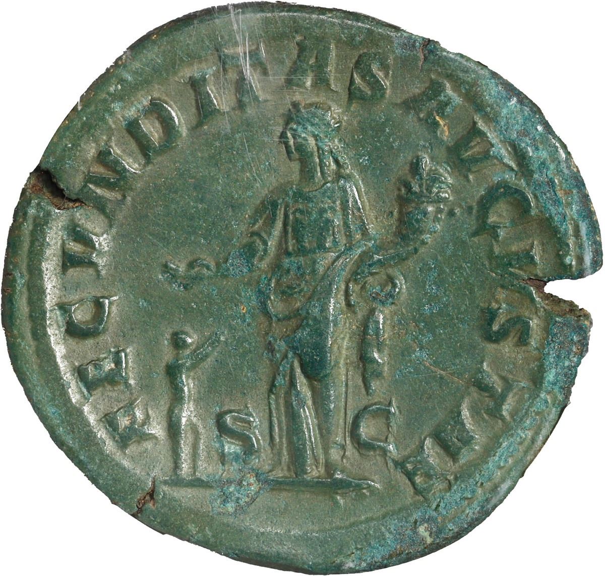 ANCIENT ROMAN, Roman Empire, AE sestertius, Julia Mamaea, 222-235 AD, NGC XF, strike 5/5, surface 4/5. 23.04 grams. IVLIA MAMAEA AVGVSTA, diademed and draped bust to right / FECVNDITAS AVGVSTAE, Fecunditas standing to left, holding cornucopiae and extending hand to child; S-C across lower fields. Medium verdigris toning with brown undertones in crevices, several die cracks and bits of corrosion, but great eye appeal. SOLD FOR THE BENEFIT OF THE 1715 FLEET SOCIETY.