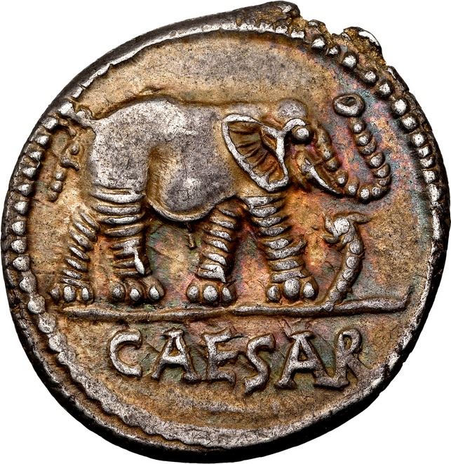 ANCIENT ROMAN, Roman Empire, AR denarius, Julius Caesar, ca. 49-48 BC, military mint traveling with Caesar, NGC AU Star / strike 5/5, surface 5/5. Crawford 443/1; RSC 49. 3.86 grams. Elephant advancing right, trampling on horned serpent / Emblems of the pontificate: simpulum, aspergillum, securis, and apex. Eye-appealing iridescent toning, well centered and sharply struck with clear CAESAR in exergue; an iconic coin from Caesar's military mint as he crossed the Rubicon in 49 BC and very important to collectors, this a choice example.