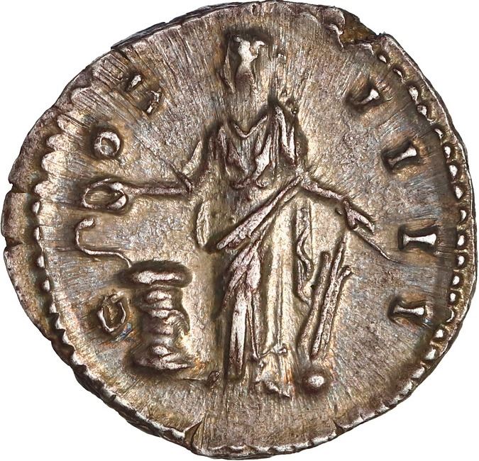 ANCIENT ROMAN, Roman Empire, Rome mint, AR denarius, Antoninus Pius, 138-161 AD, struck 148-149 AD. RIC III 181; RSC 281. 3.30 grams. ANTONINVS AVG PI-VS P P TR P XII Laureate head right / Salus standing left, holding rudder set on globe and feeding out of patera a snake coiled around and rising from altar to left. Well centered with lovely iridescent toning, XF overall.