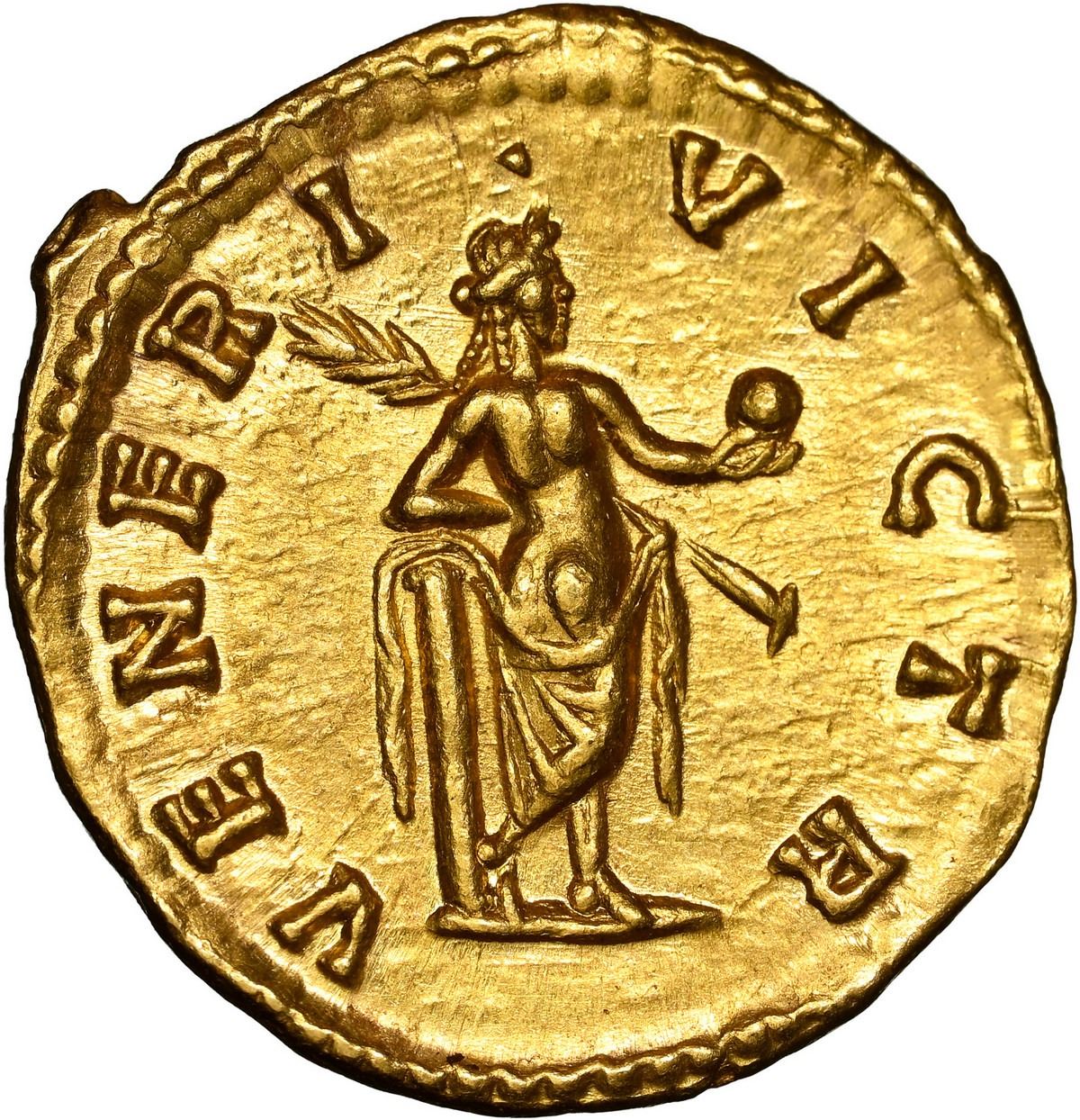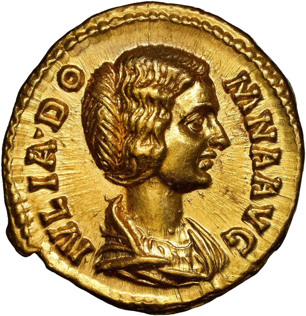 ANCIENT ROMAN, Roman Empire, Rome mint, AV aureus, Julia Domna (193-217 AD), struck 193-196 AD, very rare, NGC Choice MS, strike 5/5, surface 5/5, ex-Mirabilis. RIC IV.I (Septimius Severus) 536; Calicó-2641. 7.18 grams. 20 mm. IVLIA DOMNA AVG, draped bust of Julia Domna right, seen from front, wearing the characteristic plaited coiffure gathered into a large chignon at the back of the head / VENERI VICTR, Venus Callipyge standing right, drapery below posterior, palm branch cradled in left arm and apple in outstretched right hand, left elbow resting on a low column.