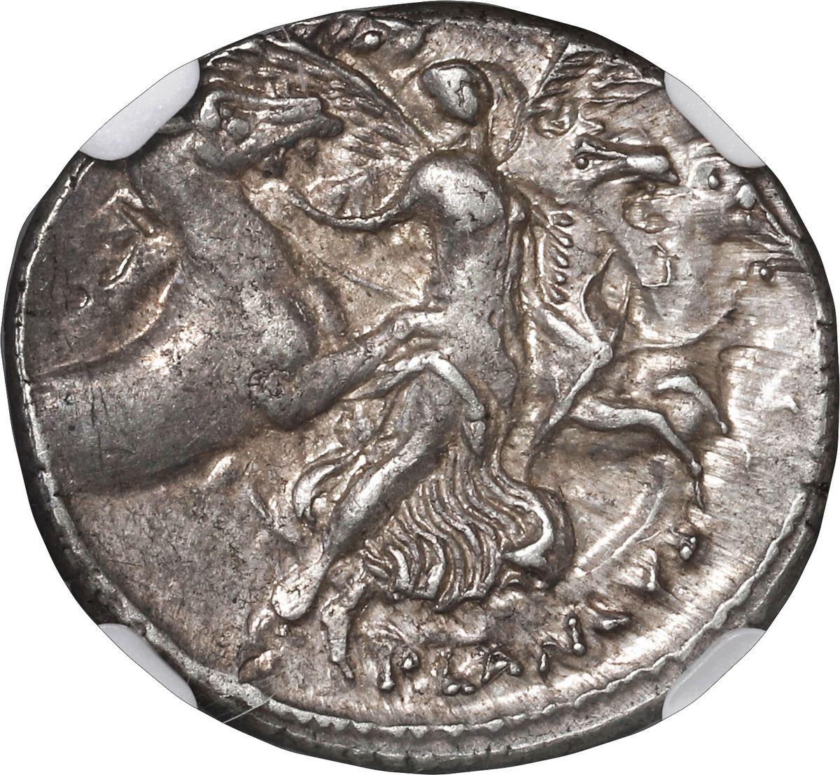 ANCIENT ROMAN, Roman Imperatorial, Rome mint, AR denarius, L. Plautius Plancus, struck ca. 47 BC, NGC AU, strike 4/5, surface 5/5. Crawford 453/1a; Sydenham 959; CRI 29. 3.95 grams. L PLAVTIVS, Medusa, facing, small coiled serpents flanking / PLANCVS, Aurora flying right, holding palm frond and conducting four horses of the sun. Nicely centered with clear Medusa head, rather modest toning overall. NGC #8362291-006.