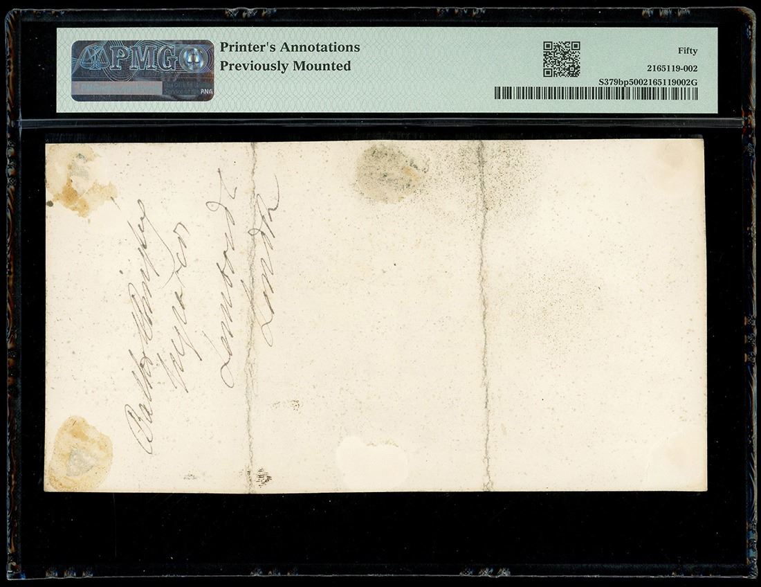 ARGENTINA, Buenos Aires, Provincia de Buenos Ayres, 10 pesos front proof, (1841), PMG AU 50, finest and only example in the PMG census. Pick-S379bp. Very rare front proof for the Argentinean 10 pesos issued in 1841 printed by Wilson & Sons of London. This type features the date partially printed as Marzo 1, 184_ as on the issued version (Pick-S379b). Boldly printed on thick paper with two vertical folds, the reverse blank but for some penned printer's annotations and mounting spots. This is the only proof example listed in the PMG census.