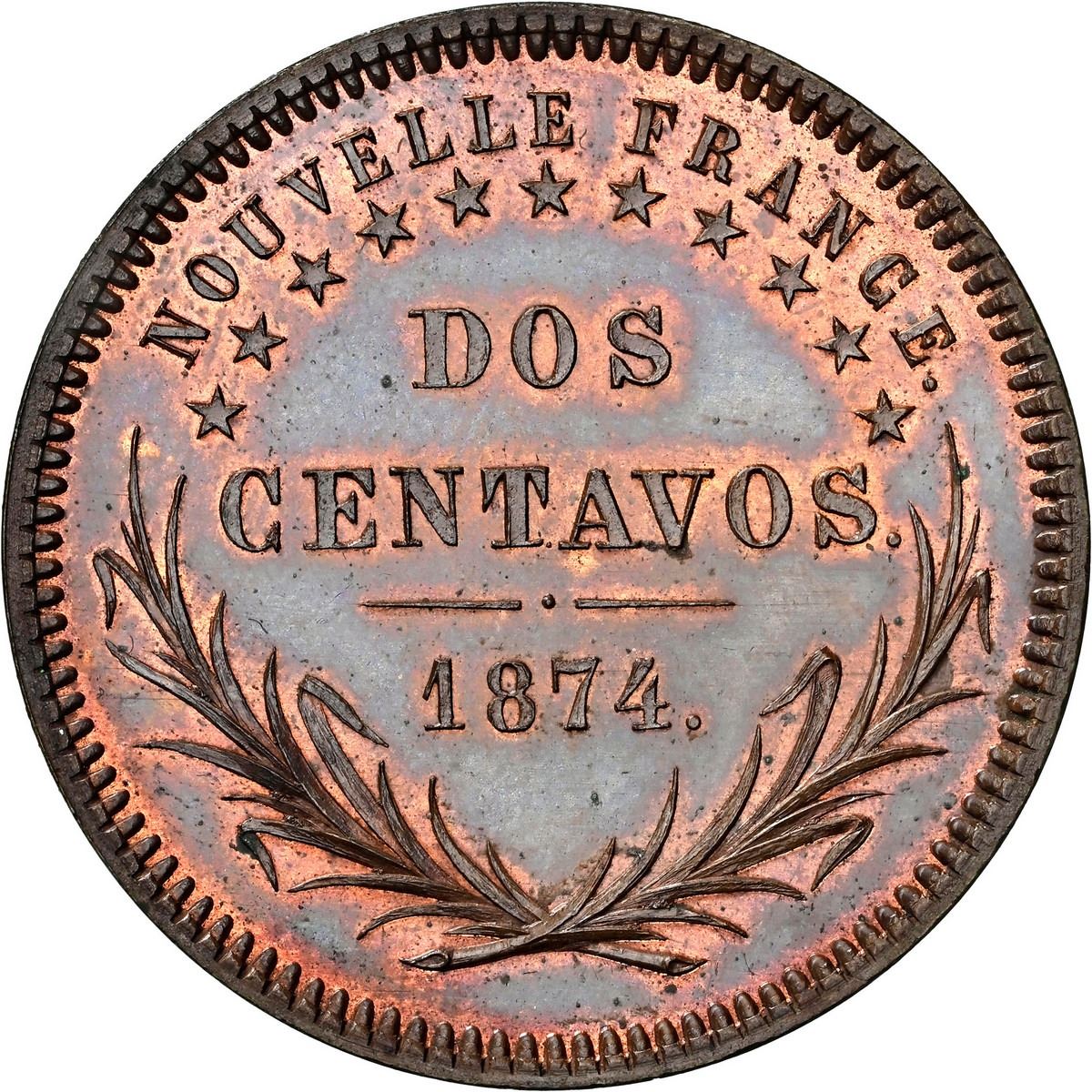 ARGENTINA - PATAGONIA and ARAUCANIA (New France), bronze proof essai 2 centavos, King Orélie-Antoine de Tounens, 1874, open 4 variety, NGC PF 64 BN (Colección Val y Mexía Label). KM-X1; VG-3859. Deep indigo toning in centers with bright original copper color in legends, some speckling but no marks or wear, scarce die variety and overall a bit scarcer than the only other denomination made (1 peso) in this odd but clearly professionally produced fantasy coinage for a "kingdom" that never existed. In effect these 1874 issues were propaganda, struck for Frenchman Orélie-Antoine de Tounens (misspelled as ORLLIE on the coins) for his self-proclaimed Kingdom of Araucania and Patagonia, where he had formed an alliance with the local Mapuche natives, who agreed to his stature under the promise of French arms and assistance against the Chilean army, which soon arrested and deported him to France. Pedigreed to the Val y Mexía Collection.