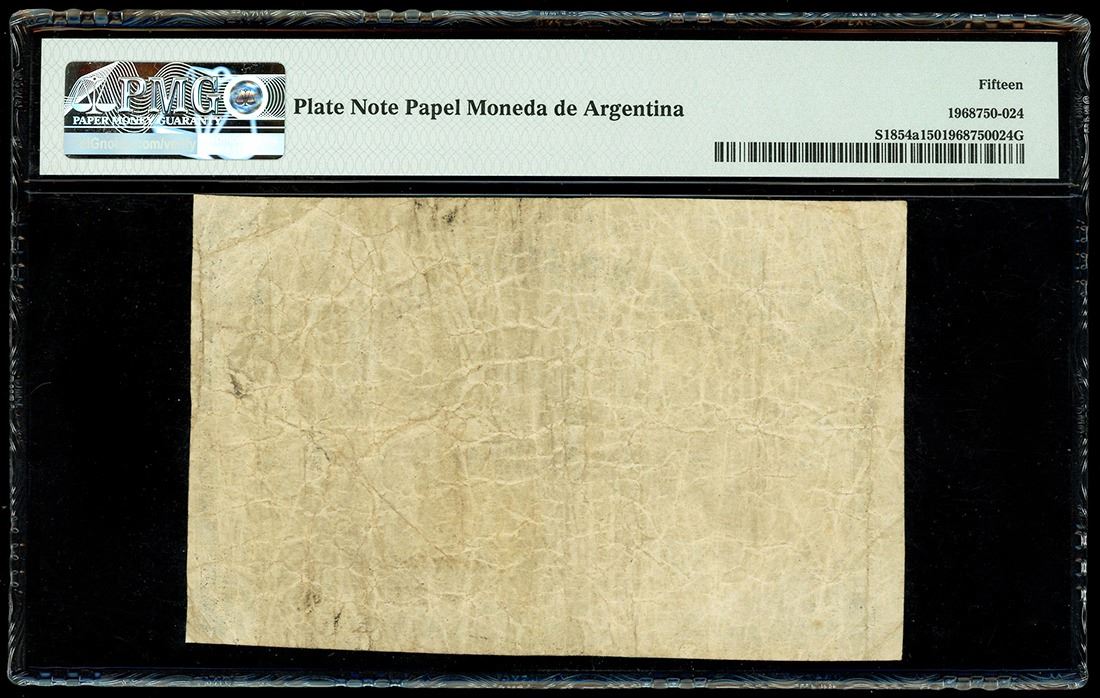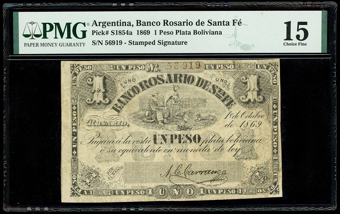 ARGENTINA, Rosario, Banco Rosario de Santa Fe, 1 peso plata boliviana, 1-10-1869, serial 56919, PMG Choice F 15, Bauman Plate Note. Bauman-SFE-182b; Pick-S1854a. Circulated yet with bold design and stamped signature, very rare note from this bank and with an appealing provenance. Pedigreed to the Bauman Collection and plated in his book Papel Moneda de Argentina (2016).
