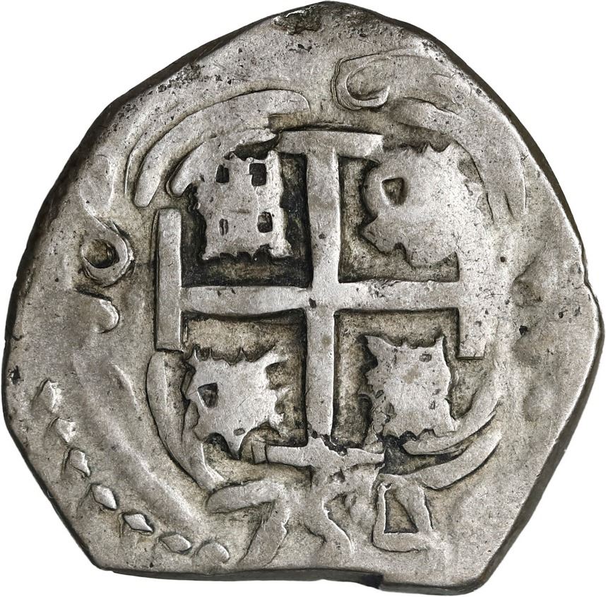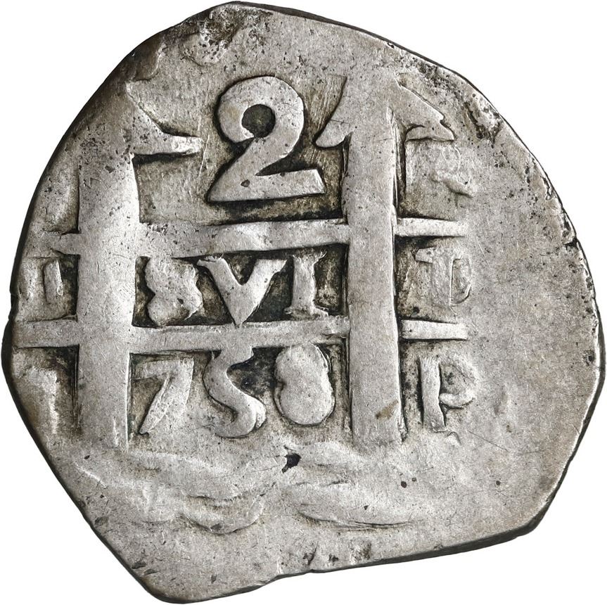 ARGENTINA, Tucumán, "imitation cob" 2 reales, "758" and "754" dates (1820-24), very rare. Janson-13.1; KM-unl. Choice full cross-lions-castles, full but off-center pillars-and-waves, a particularly rare variety with two different "dates" (758 between pillars and 754 below cross), also with clear T over o at center-right on pillars side, AVF with contrasting toning.
