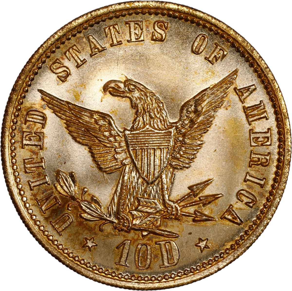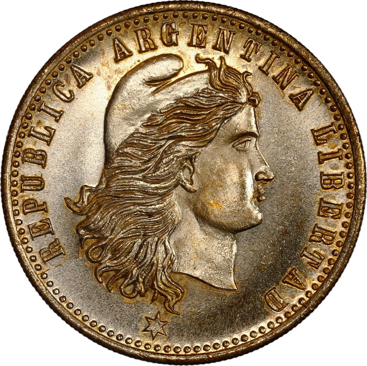 ARGENTINA, gilt bronze $10 gaming token, no date (late 1800s). 6.86 grams. Obverse with capped bust of Liberty facing right with REPUBLICA ARGENTINA LIBERTAD above and star below; reverse imitative of the US $10 gold piece with eagle holding olive branch and arrows above 10D flanked by stars, UNITED STATES OF AMERICA above; reeded edge. Brilliant Gem token with lustrous, pale golden surfaces and sharp details.