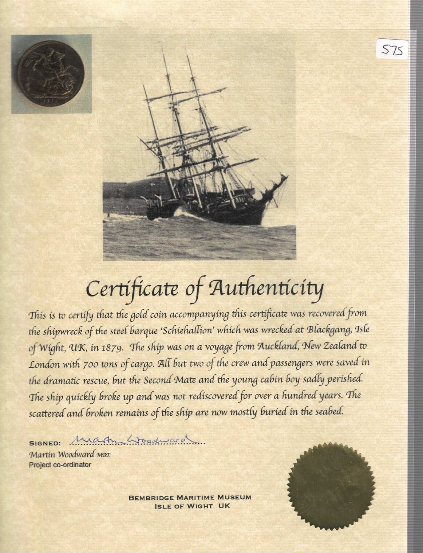 AUSTRALIA (under Great Britain), Melbourne, gold sovereign, Victoria (young head), 1874, NGC AU 55 (Shipwreck Blue Label). Sp-3857; KM-7; Fr-16. 7.97 grams. Muted luster but problem-free and high grade for this wreck (best one found, according to the salvor). The gold coins from this wreck are suspected to be from a box of coins lost by the cabin boy, according to records. With original photo-certificate from the salvor. Recovered from: Schiehallion, sunk in 1879 off the Isle of Wight, England