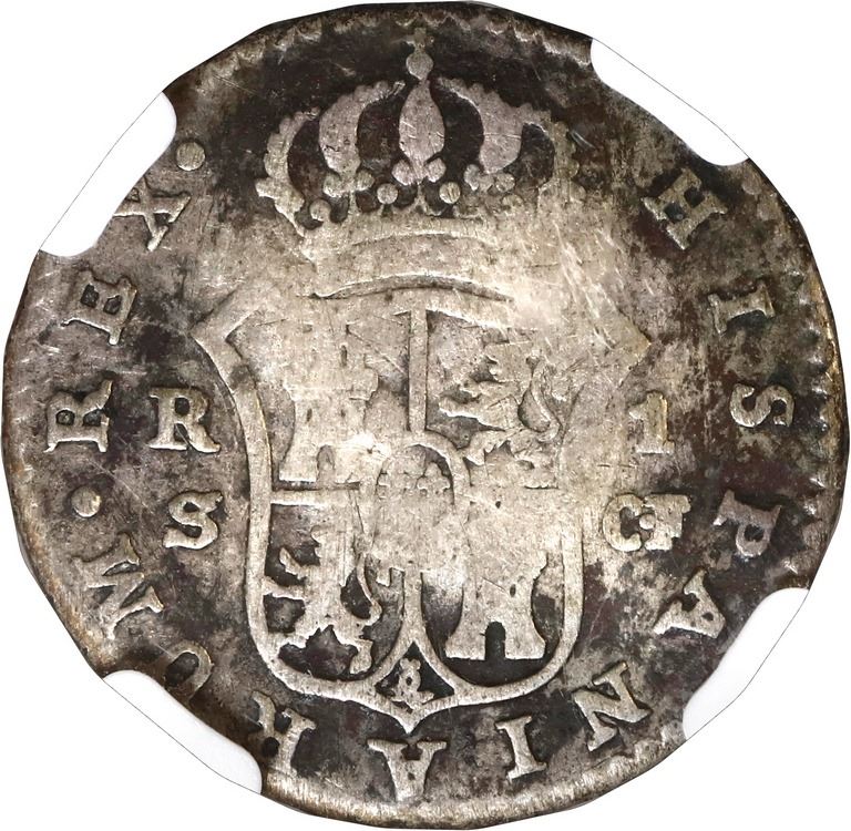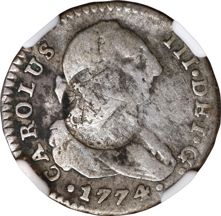 AZORES (under Portugal), 120 reis, GP countermark (1887) on a Seville, Spain, bust 1 real, Charles III, 1774 CF, NGC F details / scratches (c/s F weak). Gomes-17.03; KM-24.1. Weakly struck yet full crown countermark on the bust of a well-circulated host coin, several scratches and dark patches in the fields.