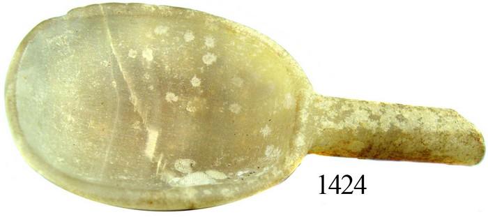 Alabaster spoon fragment. 25.2 grams, about 3¼" x 1-5/8". Made from an opaque white stone known as alabaster (first we have seen from a wreck), this spoon bowl and section of handle shows light encrustation throughout, with natural fissure in the material that does not appear to affect the integrity, which is intact except for the rest of the handle. From the Capitana El Rubí and pedigreed to Art McKee's Sunken Treasure Museum, with certificate.