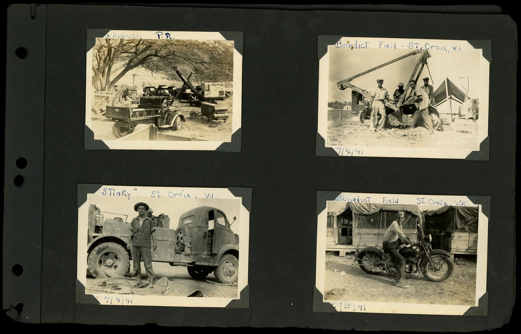 Album of black-and-white photos and negatives showing US military in the Virgin Islands, ca. 1940-41. negatives 3" x 2", prints 3-1/2" x 2-1/2". Scenes of everyday life in the Virgin Islands for military servicepeople named "Mush," "Tina," Forsythe," and "Stinky," and many now-classic cars and excavating equipment. Specific locations include Crammers Park, Benedict Field, Airdrome runway and Harris Bluff.