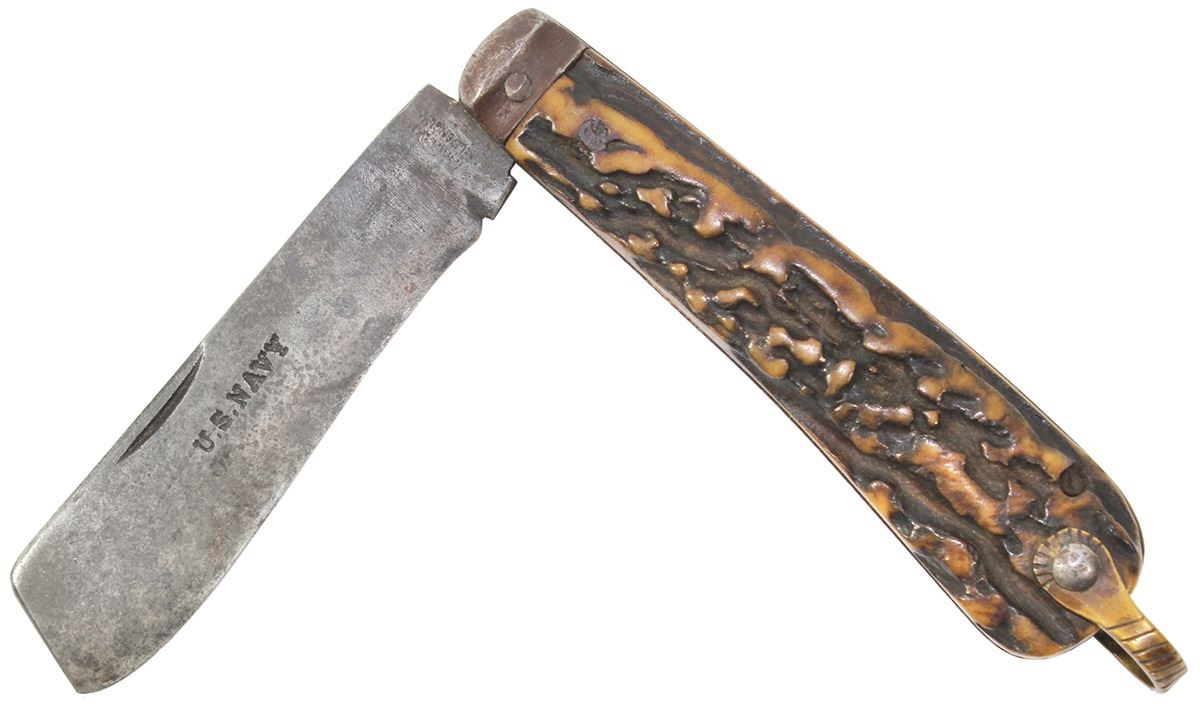 American Civil War era naval sailor's rope knife, marked U.S. Navy. 140 grams, 4-1/2" long. Single-bladed sailor's rope knife with faint maker's marks and "U.S. Navy" on blade, original staghorn grips, brass lanyard ring, age toning and fine pitting. A similar knife was found on the wreck of the USS Cairo sunk during the Civil War. With photo-certificate.