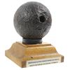 American Revolutionary War 12-pounder mortar shell with wooden base, found in Philadelphia, 1777. 3252 grams total, 2761 grams for shell, 4-1/2" diameter. Mortar shells called "bombs" in early accounts were fired out of mortars called "coehorns" after their inventor, and shells up to twelve pounds in size were used on ships as grenades during boarding actions, filled with powder and ignited with a wooden fuse driven into the hole in the shell. This example was found near the site of Fort Mifflin on the Delaware River and has been conserved and well preserved, the iron stable and solid, with a lightly aged pitted surface. Comes with a custom wood stand. With photo-certificate.