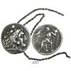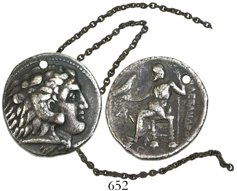 Ancient Greek tetradrachm of Alexander the Great (323-336 BC), with hole at top and small piece of chain as used as a medallion by someone on the wreck. Price-3426; SNG Saroglos-592. 17.90 grams. Very rare and unusual find as a piece of historical jewelry from the 1800s, the coin very solid and well preserved (no corrosion, VF details, nicely toned), attributed as follows: Ptolemaic Kings of Egypt, Ptolemy I Soter as Satrap, 323-305 BC, in the name and types of Alexander III of Macedon, Arados mint, struck ca. 320/19-315 BC, with head of Herakles right, wearing lion skin / ALEXANDROI, Zeus Aetophorous seated left, legs crossed; AP monogram in left field. Recovered from: Unidentified mid-1800s wreck in the English Channel