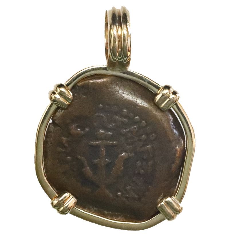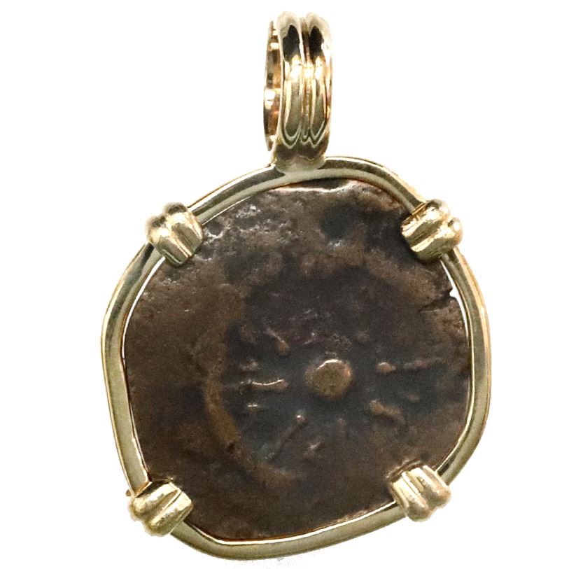 Ancient Judaea, AE prutah ("widow's mite"), Alexander Jannaeus (103-76 BC), mounted in 14K gold bezel with fixed bail. 4.03 grams total. Eight-ray star in diadem / anchor and king's name. Symbolic biblical coin in simple setting, both sides well struck and centered. With certificate.