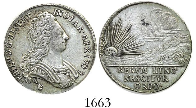 Antwerp, Brabant (Spanish Netherlands), small silver proclamation medal (jeton), Philip V, 1702. Van Loon-IV, 337. 5.33 grams. XF with hint of luster and toning, bust of king on obverse, seaside fort and radiant sun on reverse with RERVM HINC / NASCITVR / ORDO. Pedigreed to the Richard Long auction of March 1991 (lot #165).