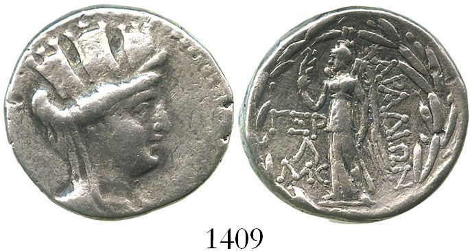 Arados, AR tetradrachm, ca. 146-37 BC. Turreted, veiled, and draped bust of Tyche right / Nike standing half-left, holding aplustre and palm; date and control letters in left field; all within wreath. Bold AVF with light toning, rim-nicks.