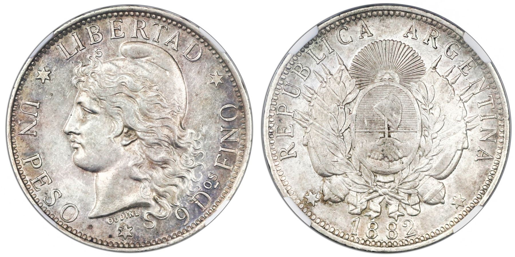 Argentina, 1 peso, 1882, NGC AU 58. KM-29. Bold strike with minimal high-point wear, faint hairlines in obverse field, very lightly toned. NGC #4670202-047.
