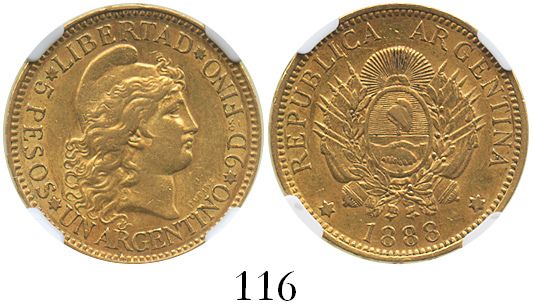 Argentina, 5 pesos / 1 argentino, 1888, encapsulated NGC AU 55. KM-31; Janson-8.1. Deep orange-gold color, minimal bagmarks.