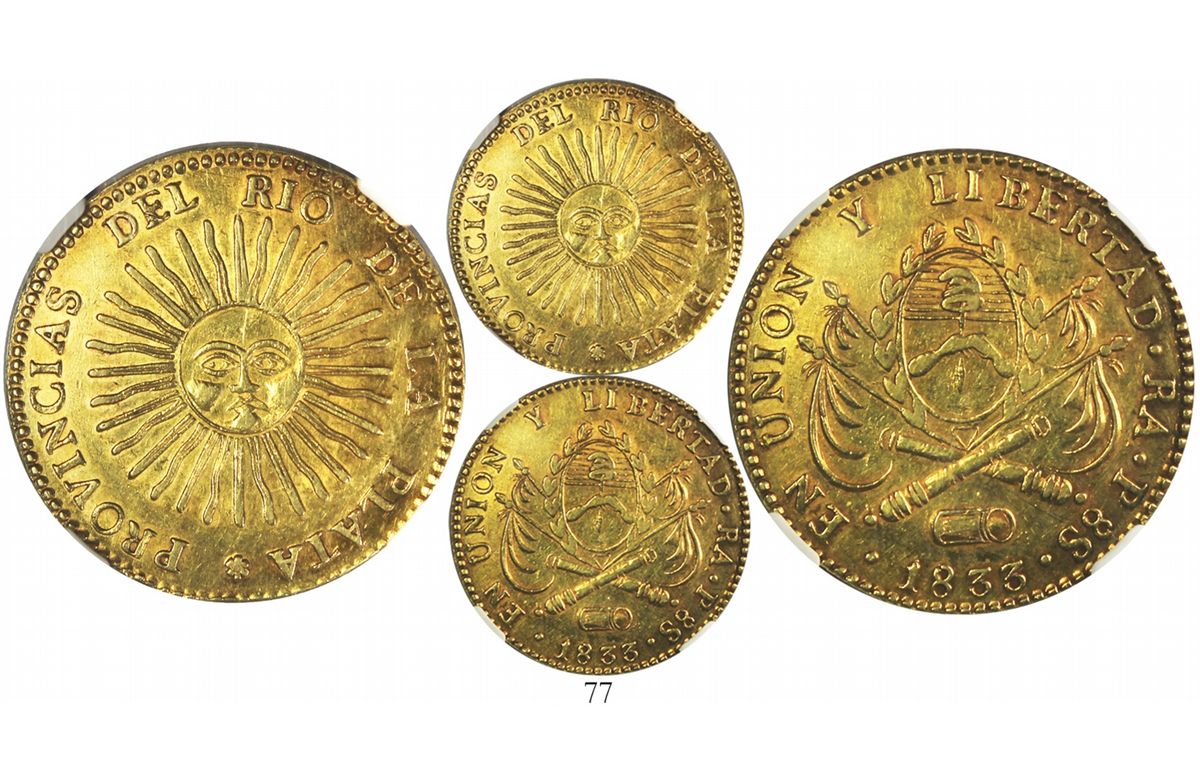 Argentina (La Rioja), 8 escudos, 1833P, encapsulated NGC AU 53. Janson-18; KM-21. Faint red toning and underlying luster, light mark below cannon, nice strike for this rare and popular "sunface" type, which seldom comes problem-free. Pedigreed to the UBS auction of September 2005 (lot #4385).