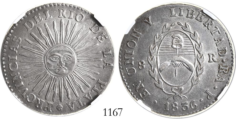 Argentina (La Rioja mint), 8 reales, 1836P, encapsulated NGC AU 50. Janson-37; KM-20. Attractively toned, slightly off-center sunface side.