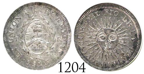 Argentina (Potosi mint), 1 real, 1813J, encapsulated NGC MS-61. Janson-13.1; KM-2.2. Choice, lustrous Mint State with small spots of toning, very rare grade (unpriced in Janson, which is the authoritative reference), popular issue made under the independent Provinces of the Rio de la Plata, whose soldiers had hijacked the colonial Potosi mint to make their coins.