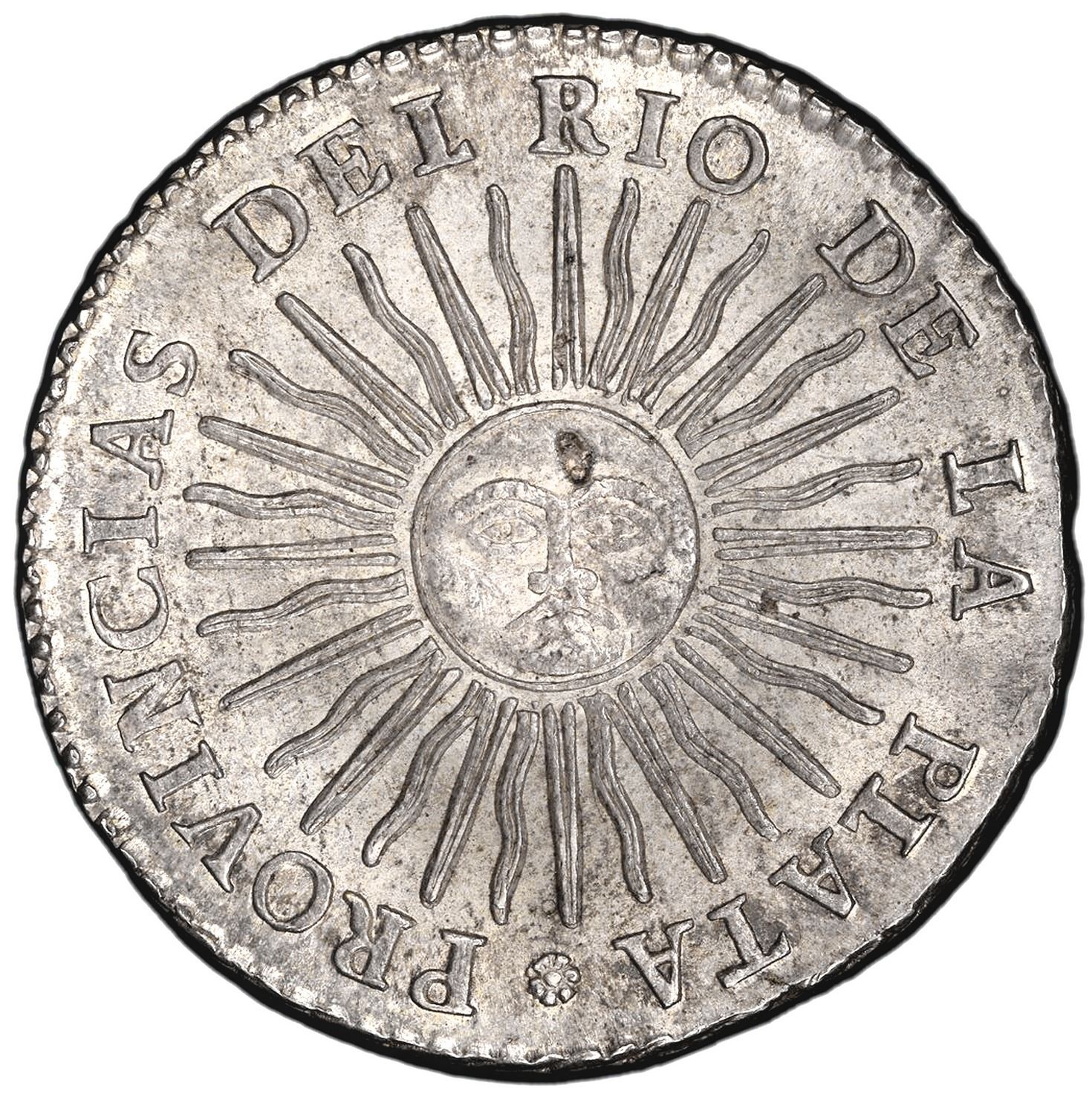 Argentina (River Plate Provinces), 8 reales, 1836 P, La Rioja mint, PCGS MS64. Janson-37; KM-20. Unusually sharp details with lustrous fields combine for a beautiful aspect, the only apparent demerit being a small, natural, crust-filled lacuna on the sunface's forehead, tied with one other for second finest in PCGS census behind a single MS64+ and a true equal to Whittier's NGC MS 64 that hammered for $8500 in Heritage last summer. PCGS #28184784.