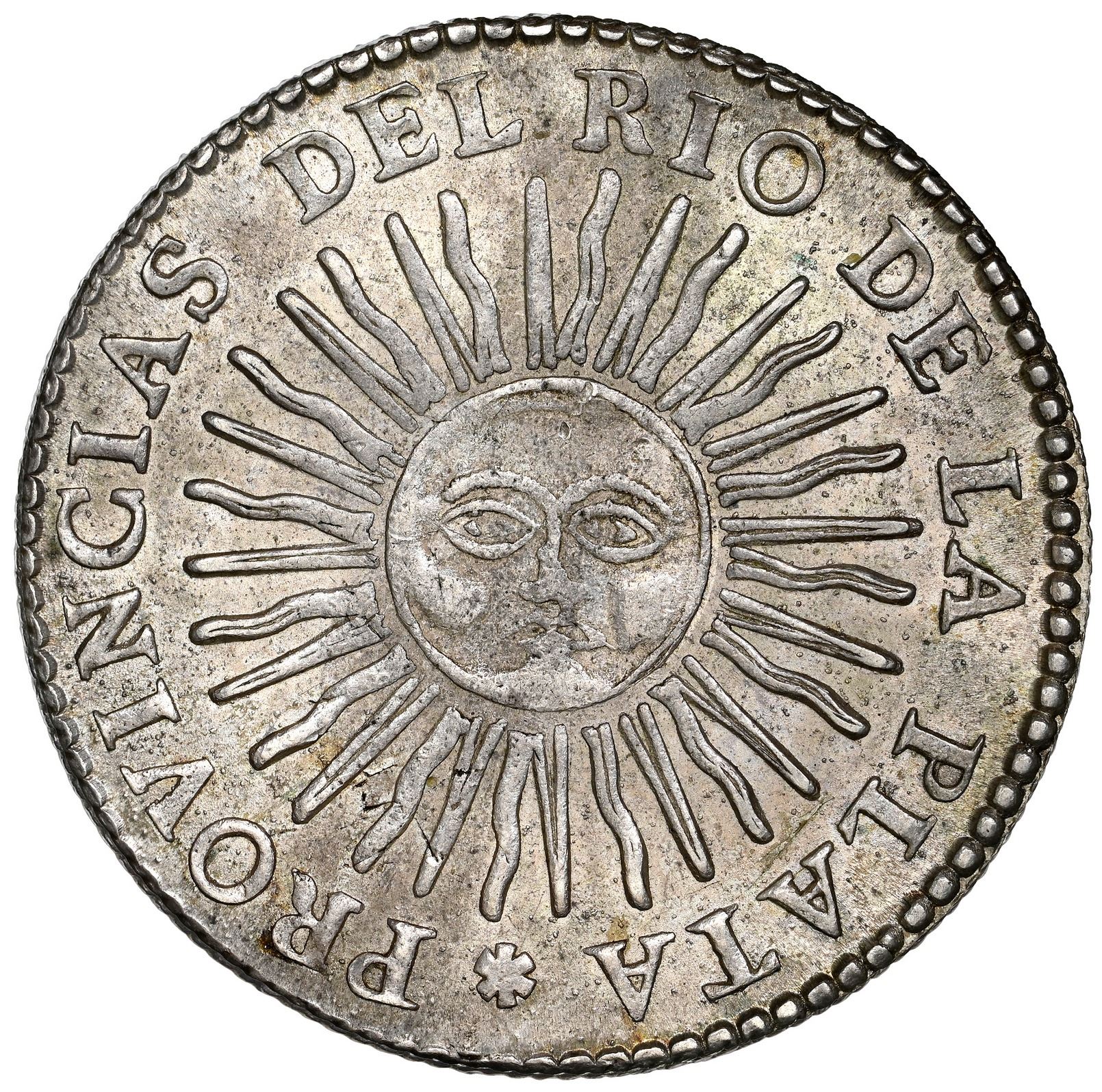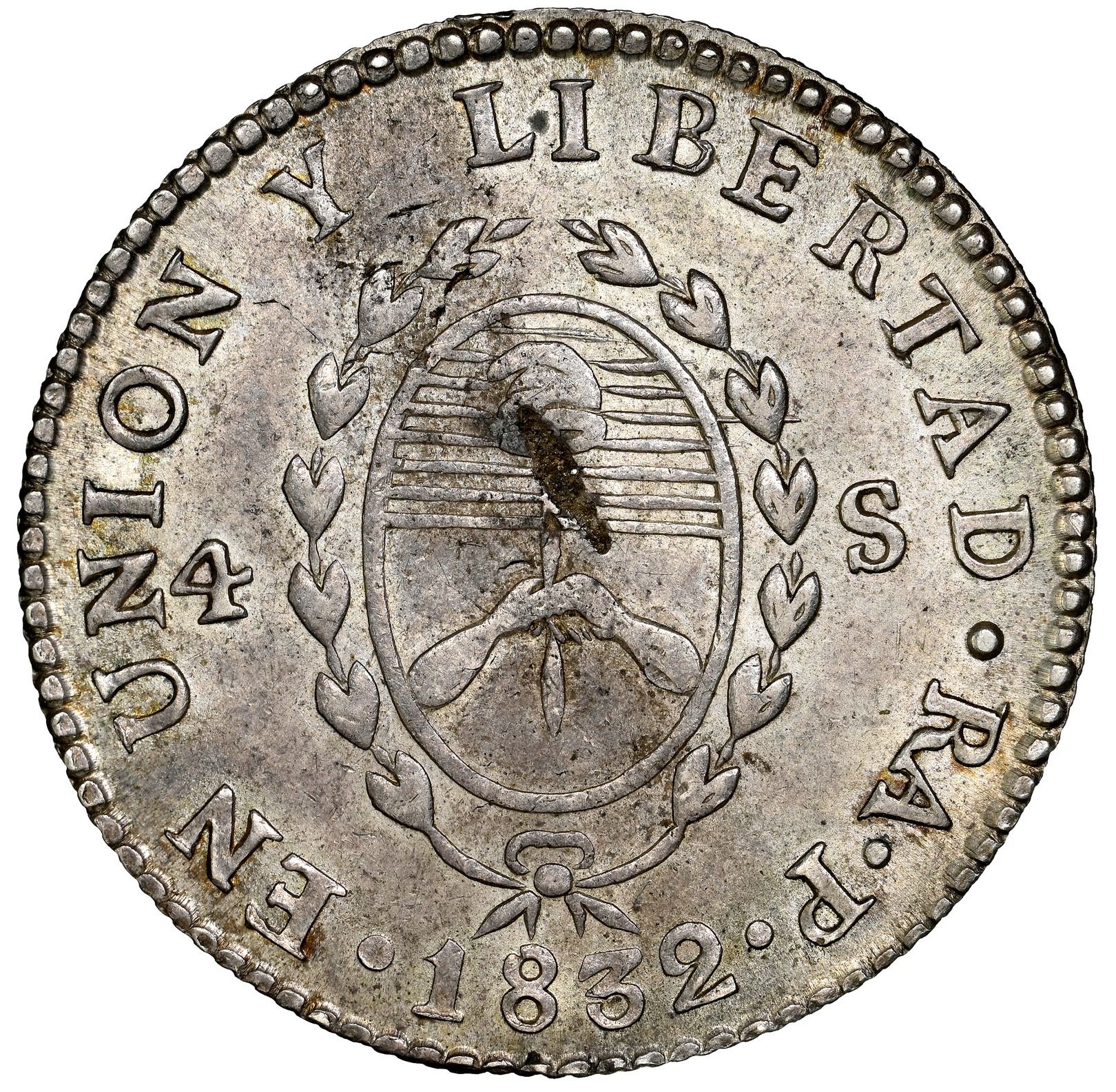 Argentina (River Plate Provinces), La Rioja mint, 4 soles, 1832 P, NGC MS 63 ("top pop"). Janson-40; KM-22. Muted luster with toning (including diagonal dark streak through center), minor natural flaw in center of shield, tied with one other for finest in current NGC census, notably superior to the Pat Johnson example.