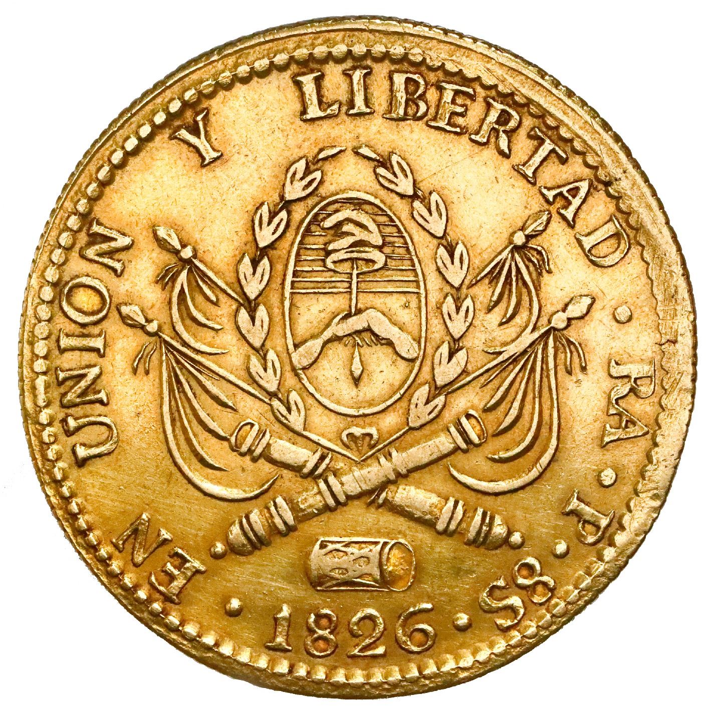Argentina (River Plate Provinces), La Rioja mint, gold 8 escudos, 1826P, very rare, NGC AU 55, ex-Madonna (stated on label). KM-21; Onza-1559; Janson-12.2. 26.77 grams. Sharp strike (particularly the ever-popular sunface motif) with unmarked fields save a few light hairlines, light high-point wear and only muted luster, typically broad rims, hint of toning around details, desirable first date of a rare and popular type dating to the early days of Argentina's independence. NGC #5931958-001. Pedigreed to the J. Madonna Collection.