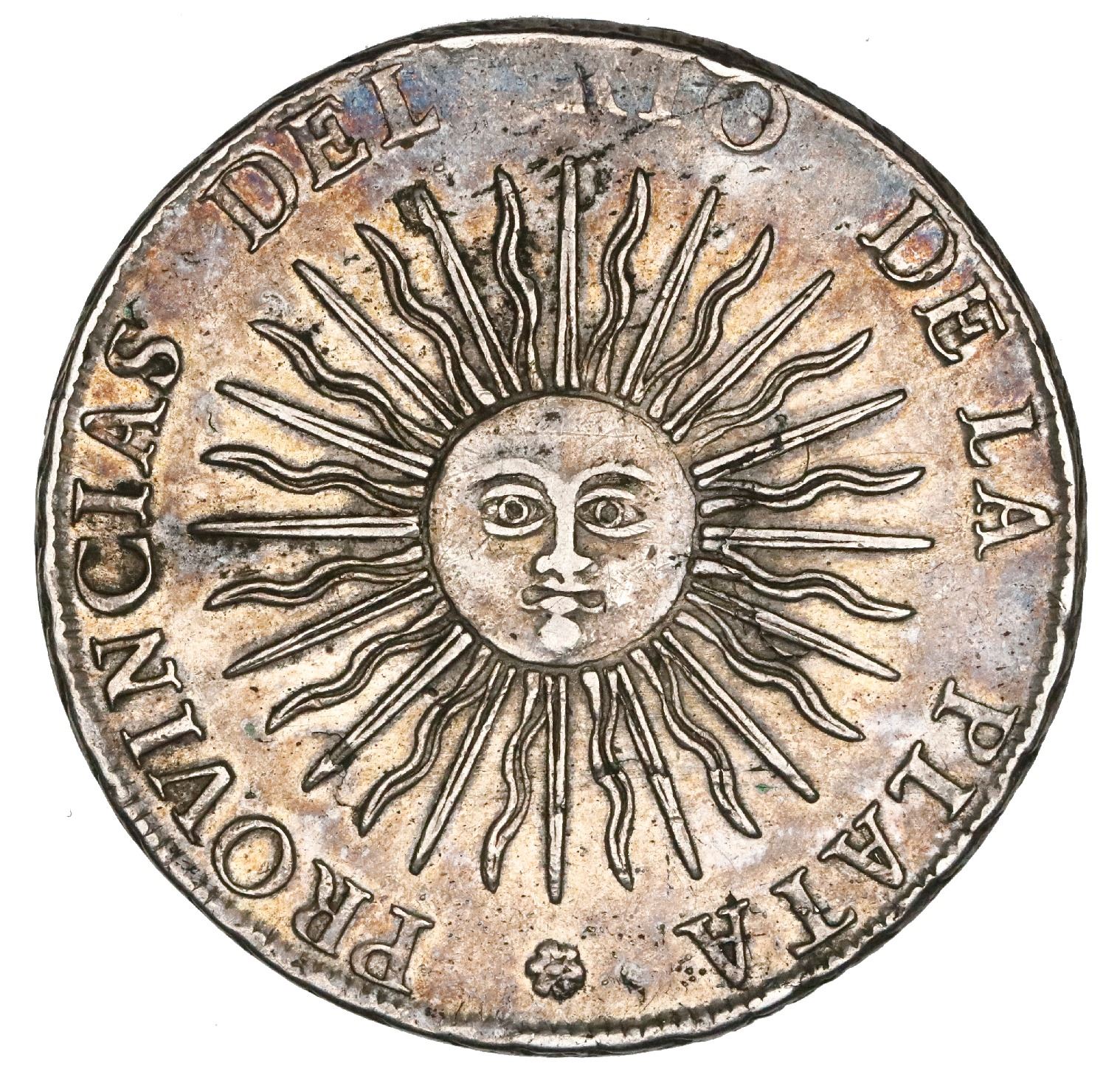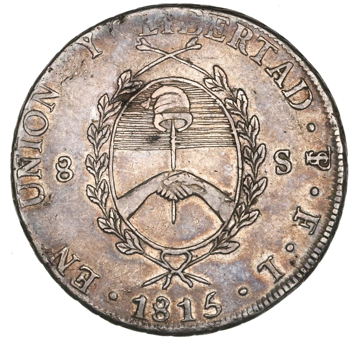 Argentina (River Plate Provinces), Potosi mint, 8 soles, 1815FL, NGC AU 53. Janson-6.1; KM-15. Attractive rainbow toning all over, good strike with mostly strong rims, light high-point wear only. NGC #5938098-002.