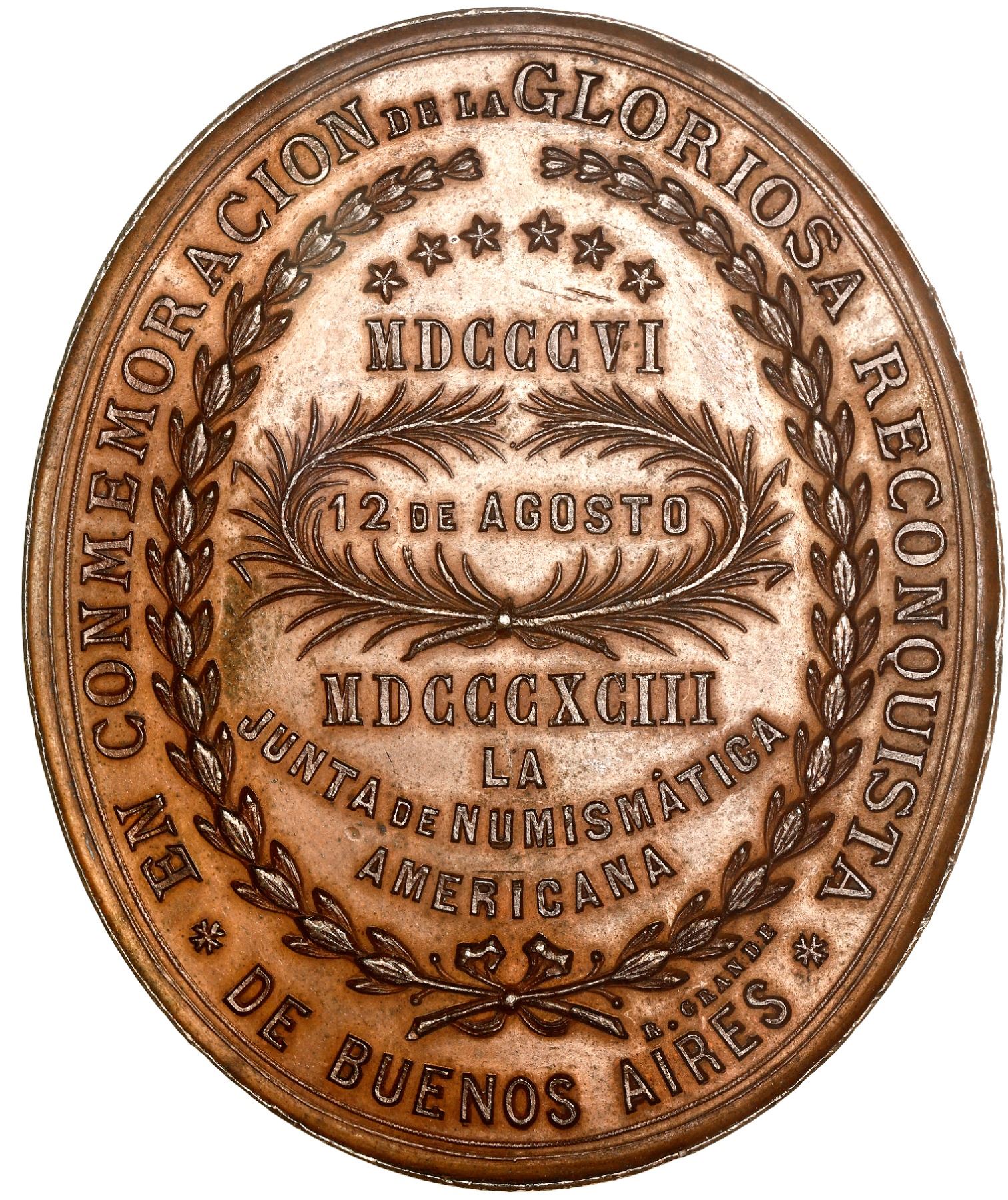 Argentina, bronze oval medal, 1893, by R. Grande, commemorating the reconquest of Buenos Aires from